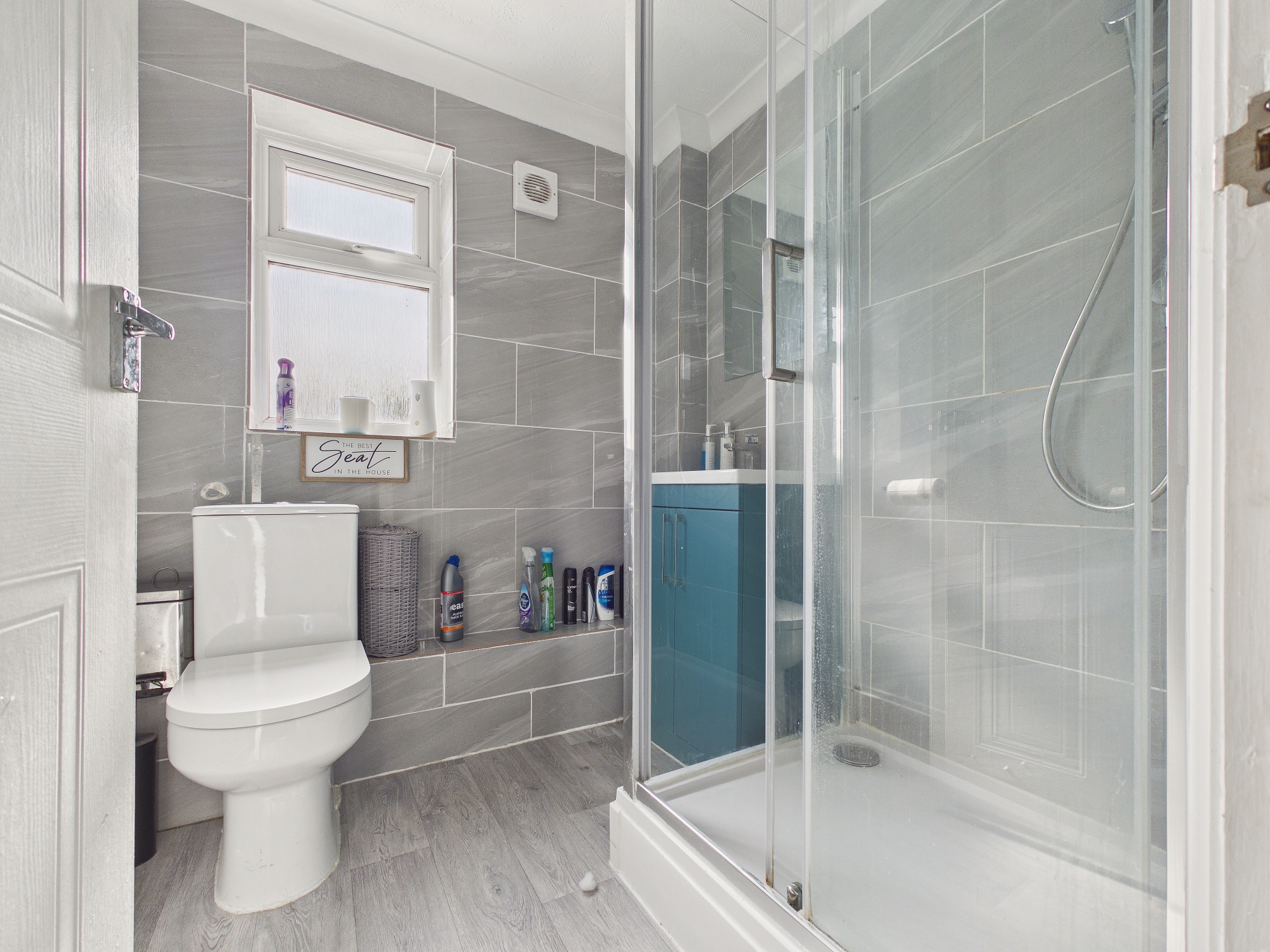 uPVC double glazed window to rear, wall mounted heated towel rail, corner shower cubicle, w.c., handwash basin inset to vanity storage unit, textured and coved ceiling, lino style flooring, partly tiled walls, extractor.