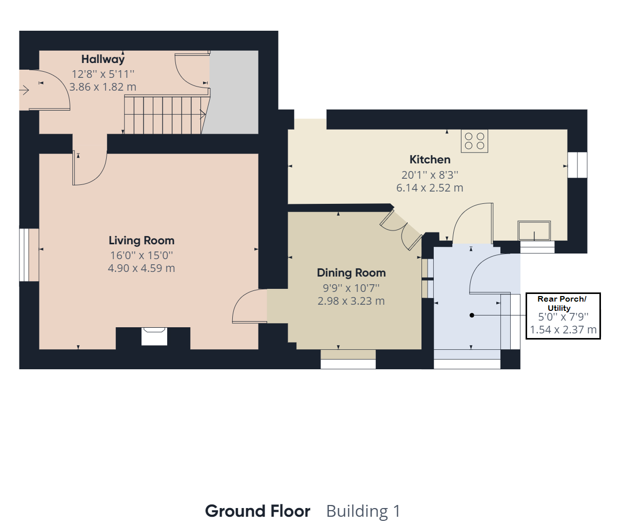 Original tiled flooring and straight staircase leading to the first floor, stopped doors opening to the understairs storage cupboard housing hot water cylinder, tall wall mounted radiator and stripped pine door leading to:-