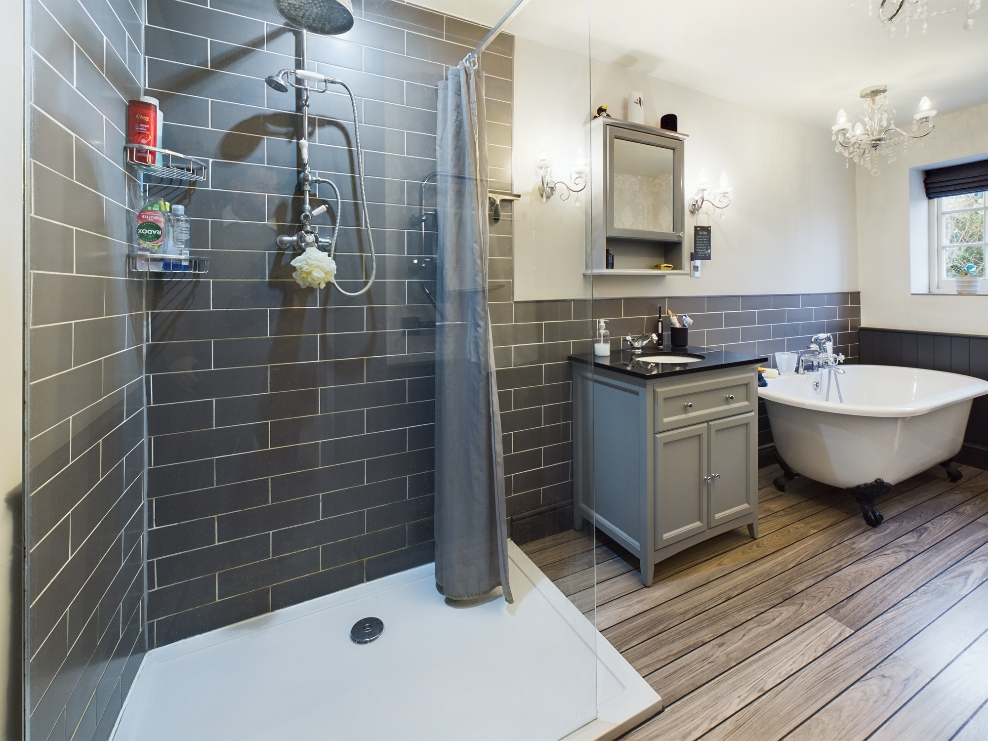 A fantastic, recently refurbished room that combines traditional with contemporary. Comprises double width, low level walk-in shower, Oval hand washbasin inset into a vanity unit with granite work surfaces, free-standing roll top bath with claw feet, low level w.c, tiling and panelling to walls, radiator and wall mounted heated towel rail.