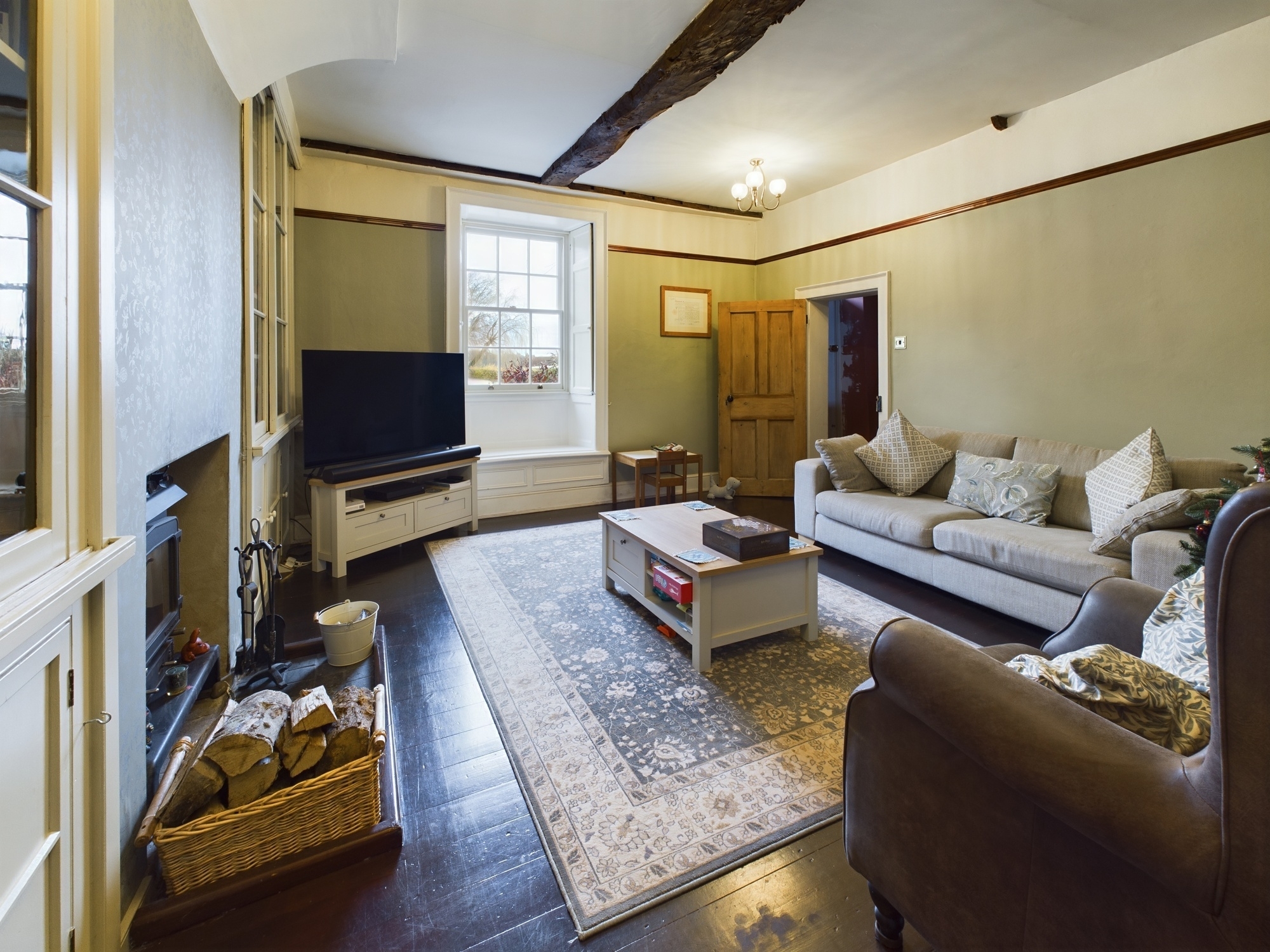 Double glazed sash windows with boxed window seat, fabulous tall ceiling with exposed beamwork, central fireplace with cast-iron store inset, built-in and recessed book shelving and storage with glazed doors, exposed wooden floorboards, feature internal former window now used as a display area, picture rails, stripped pine doors to:-