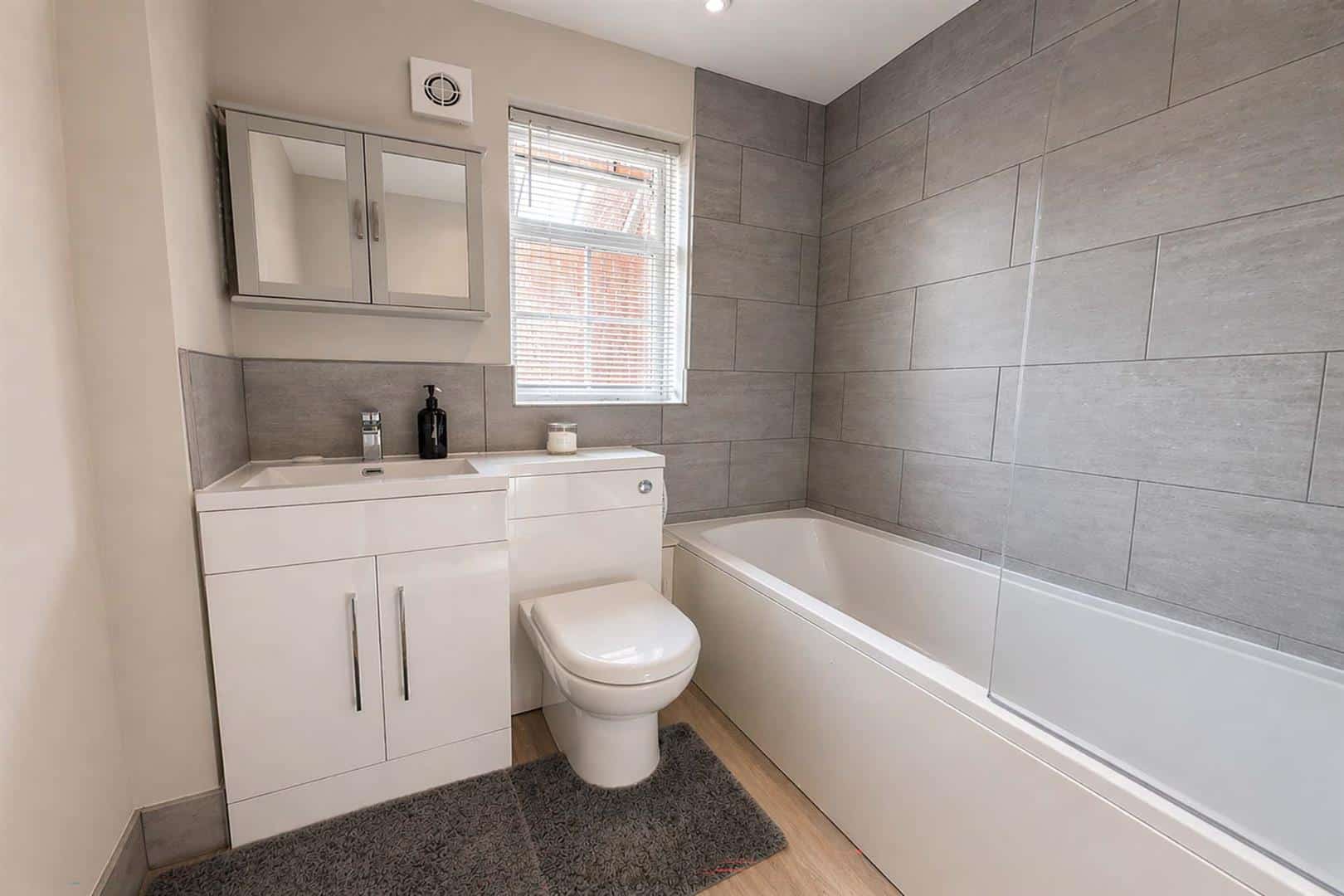 Contemporary white suite comprising low level, concealed cistern, WC, inset hand basin with counter work top and built-in storage under and panelled bath with wall mounted shower over. Window to the rear aspect. Attractively tiled to wet areas. Door to the entrance hall.