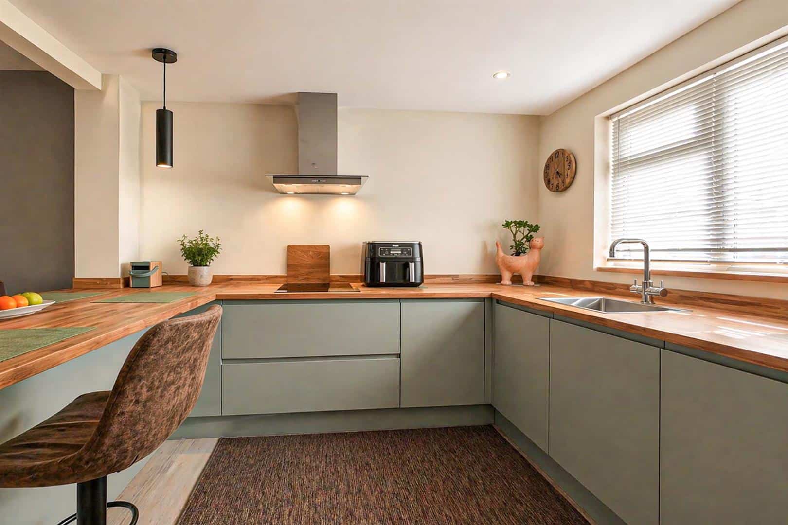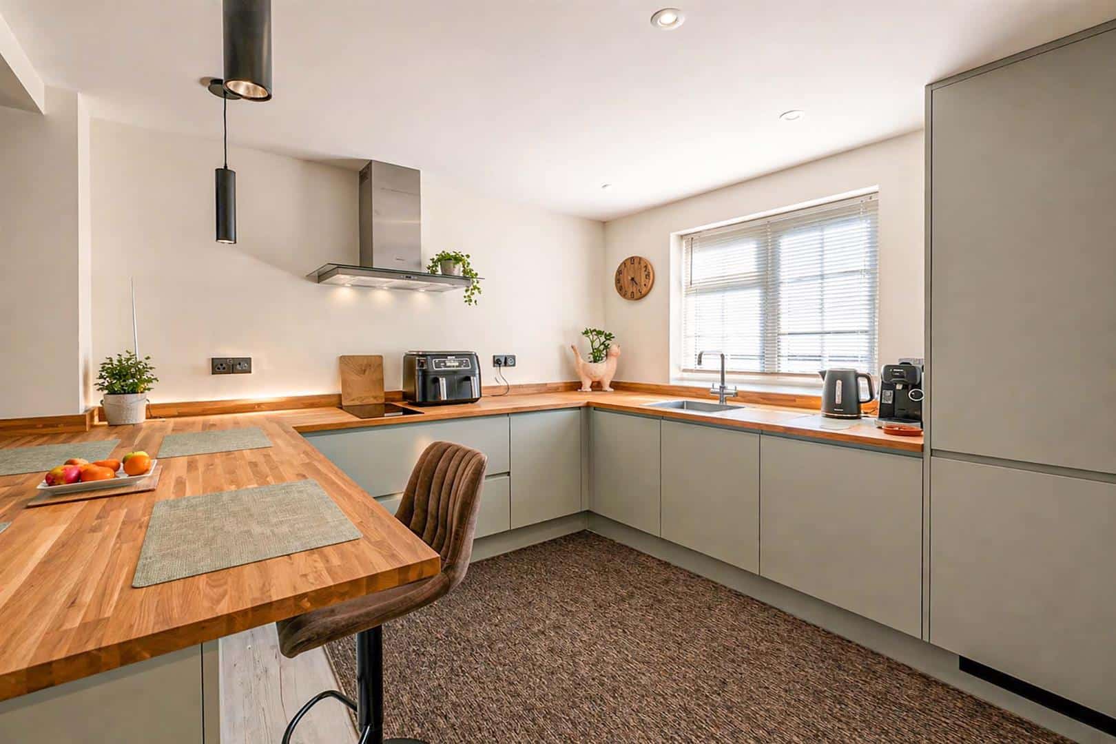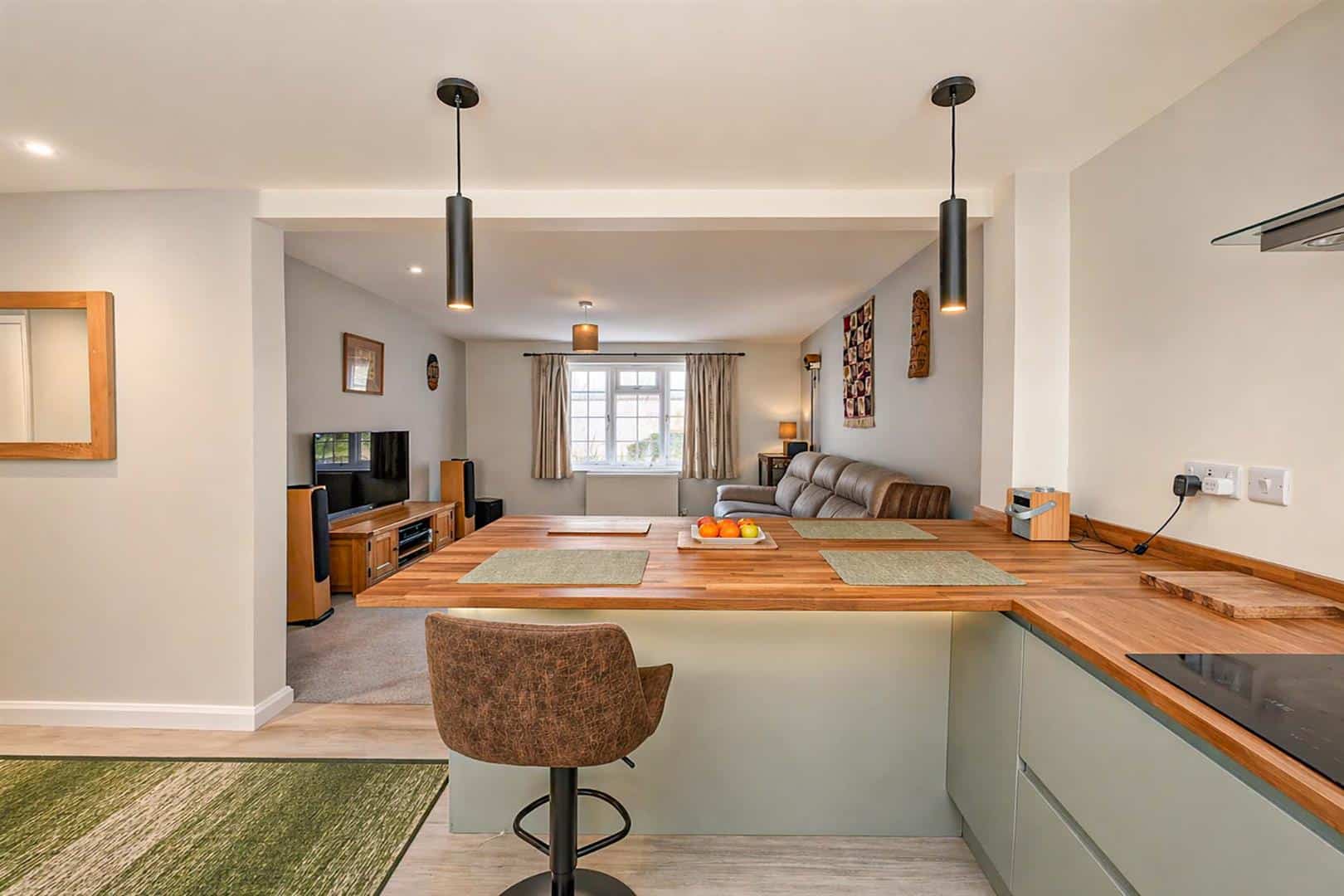 Contemporary kitchen, fitted with a range of base level cupboards with wooden worktop over, incorporating a breakfast bar seating area. Integrated fridge/freezer. Inset induction hob with stainless steel extractor over. Inset sink with mixer tap over. Window to the rear aspect. Opening to the living room and entrance hall.