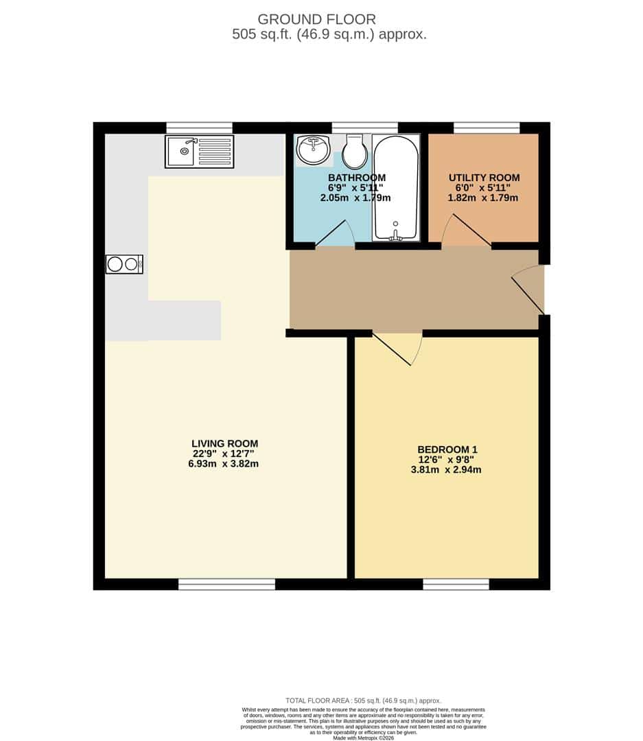 With opening to the kitchen and living room, bedroom, bathroom and utility room