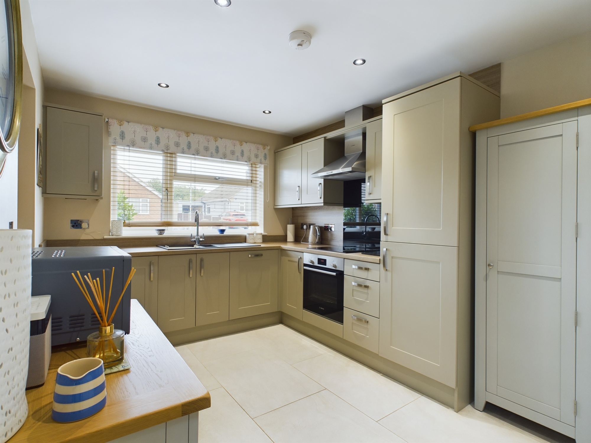 uPVC double glazed window to front, wall mounted upright radiator, tiled flooring, wall and base units under round edge worksurfaces, 1 1/2 sink drainer inset with mixer tap over, 4 ring hob inset to worksurface with oven under and extractor over with glass splashback, integral washing machine and dryer, integral dishwasher, integral fridge/freezer, ceiling spotlights, door to garage, opening through to:-