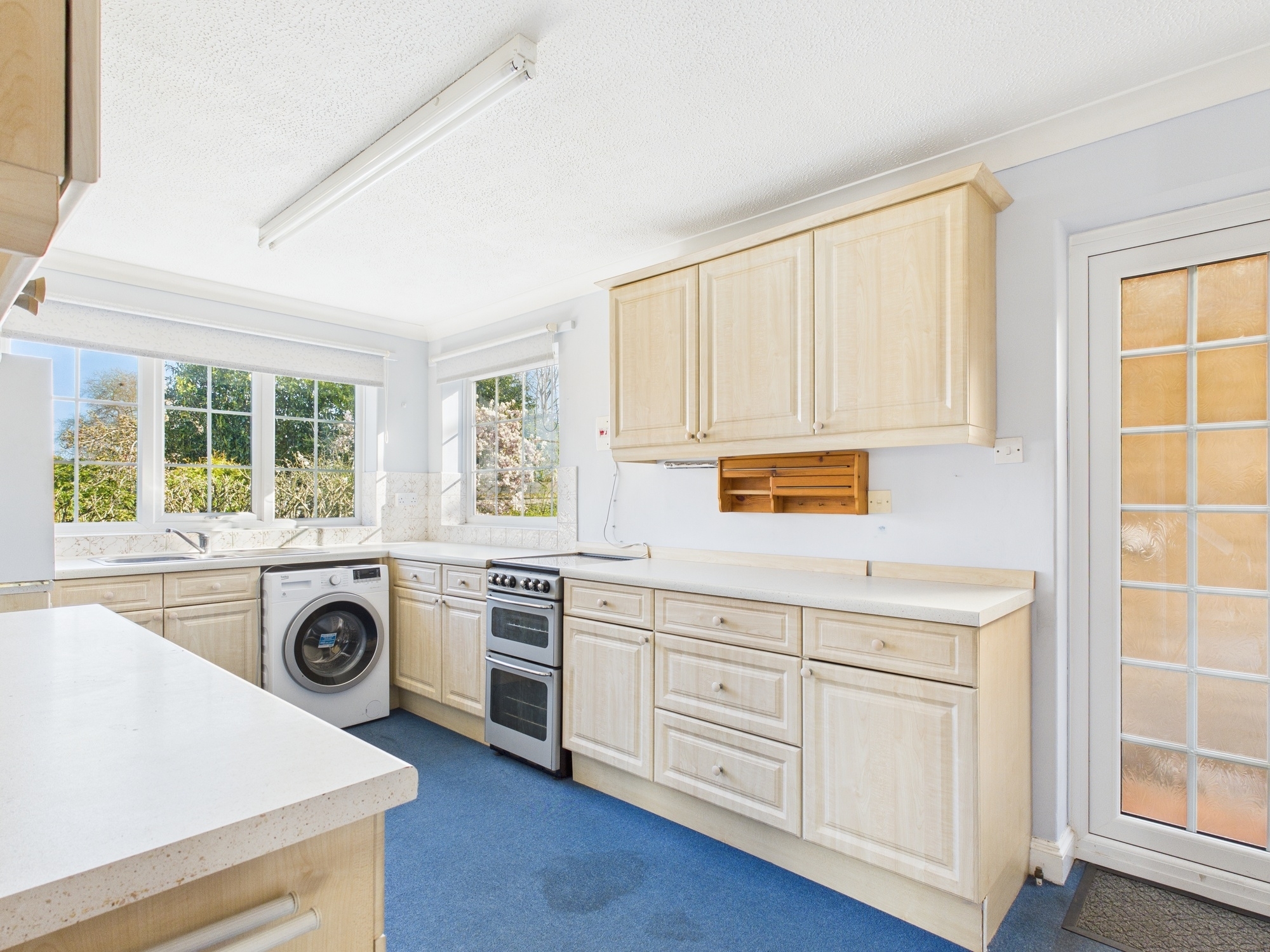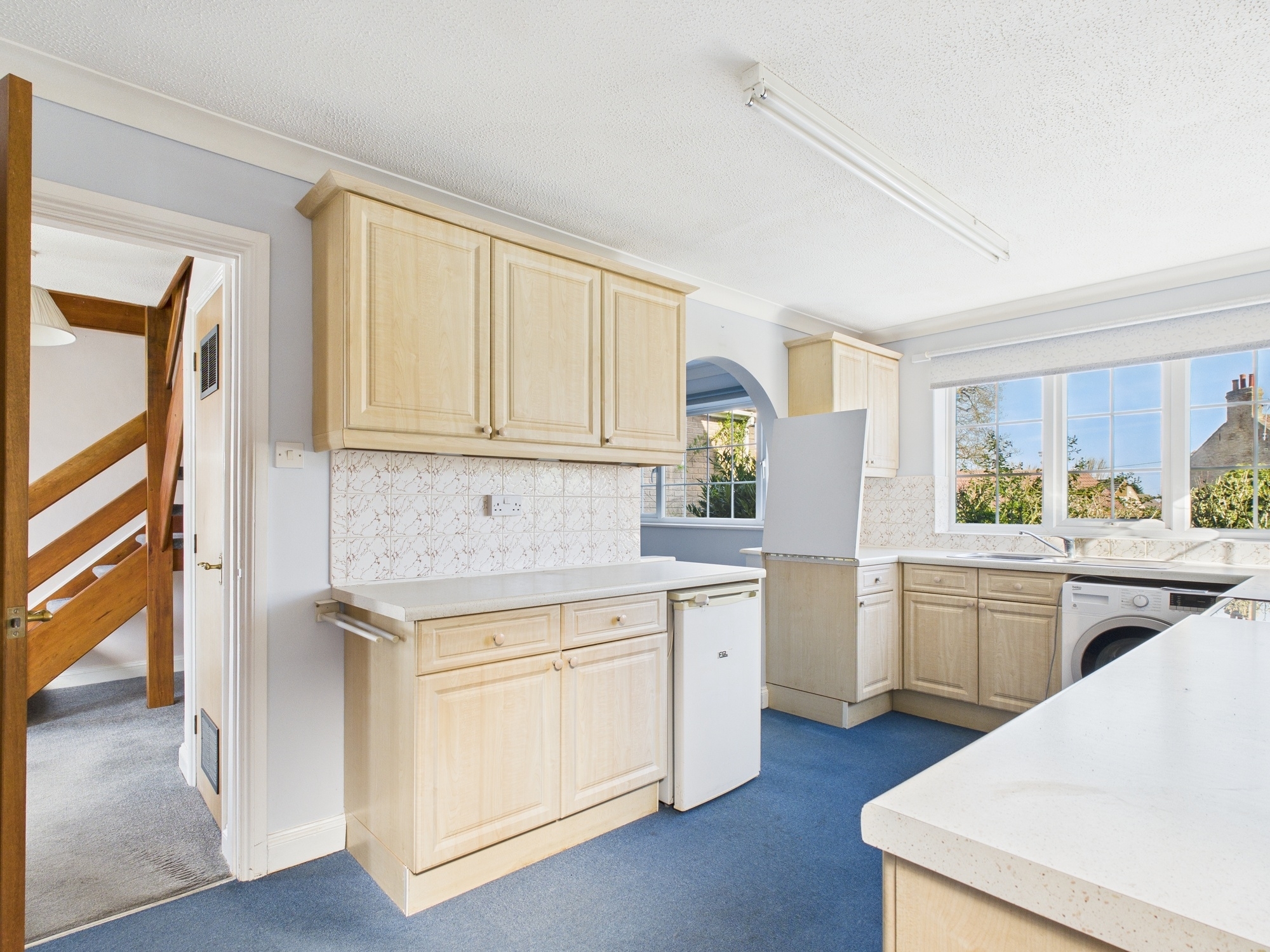uPVC double glazed windows to side and rear, wall mounted double panel radiator, door to storage cupboard, wall and base units under round edge worksurfaces, 1 1/2 stainless steel sink drainer with mixer tap over, free standing oven and hob, space for washing machine, space for under counter fridge, door to entrance lobby, part glazed door to side passage.