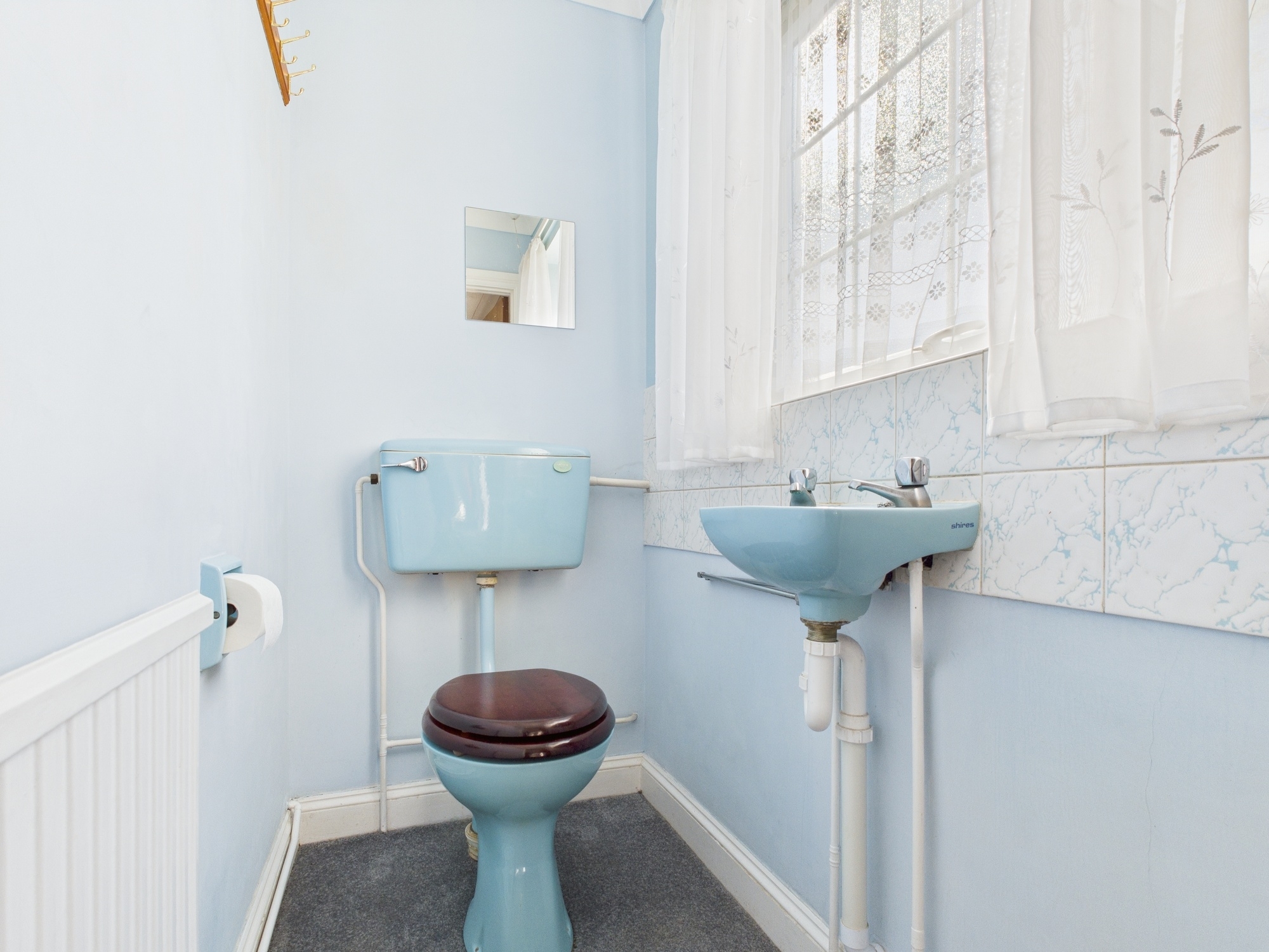 uPVC double glazed window to front, wall mounted single panel radiator, w.c., handwash basin, wall mounted coat pegs, textured and coved ceiling.