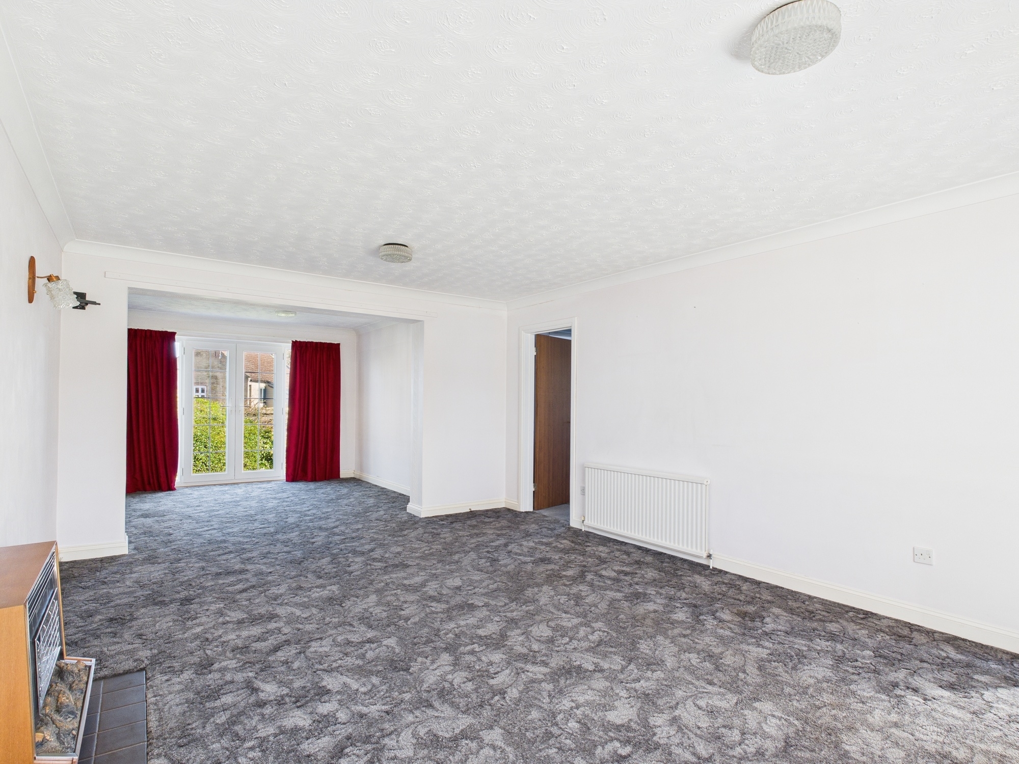 uPVC double glazed bow window to front, 2 x wall mounted double and single panel radiators, central wall mounted gas fire, door to dining room, opening through to:-