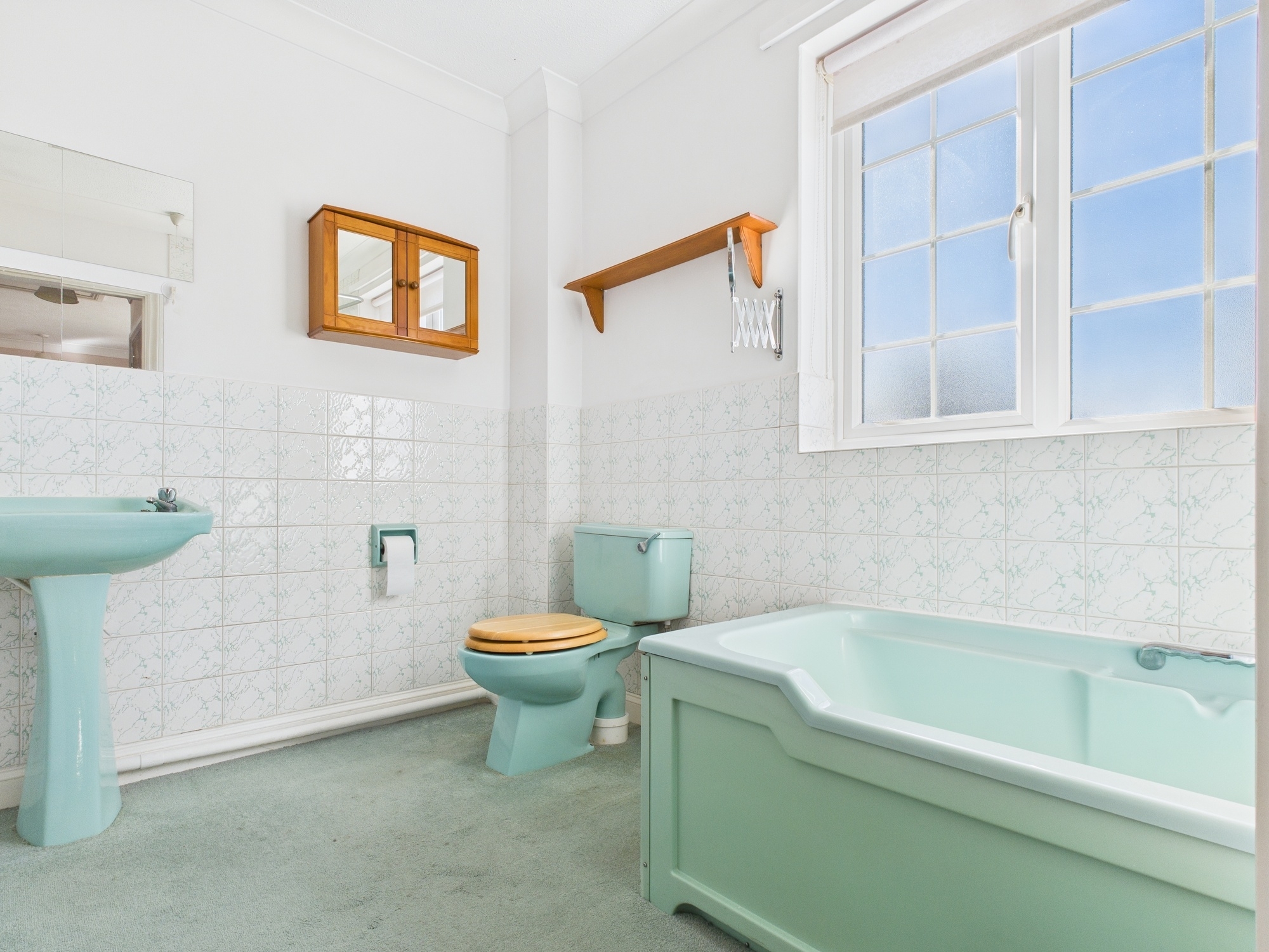 uPVC double glazed window to front, wall mounted single panel radiator, panelled bath with wall mounted shower over, w.c., pedestal handwash basin, partly tiled walls, textured and coved ceiling.
