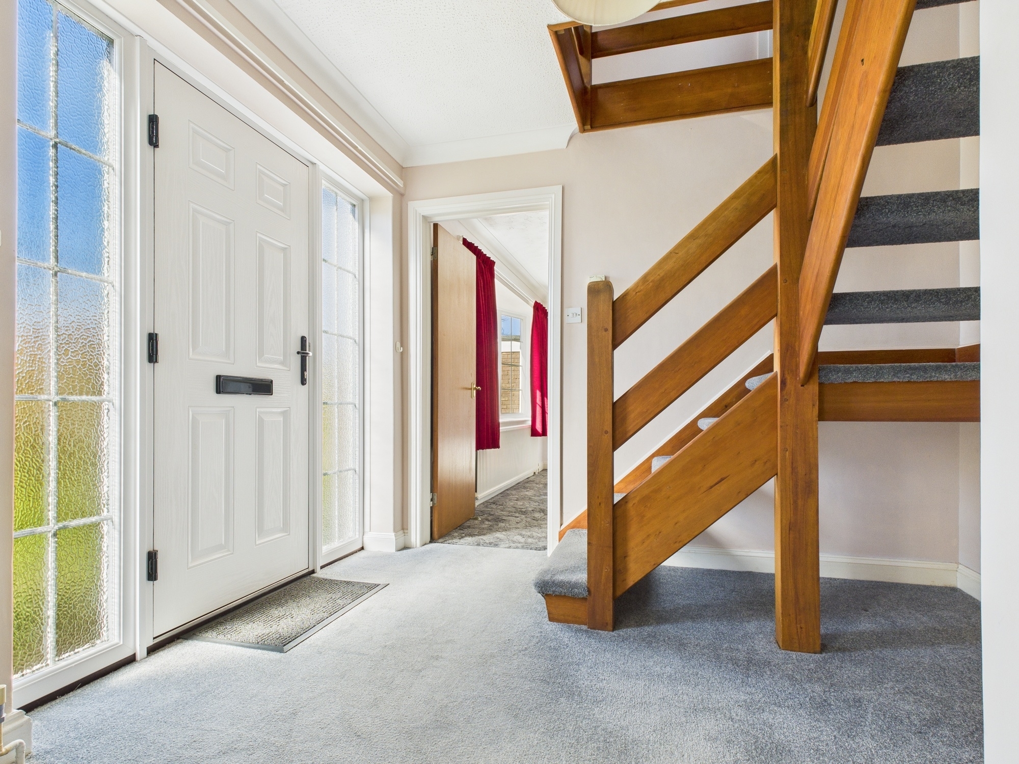 Wall mounted double panel radiator, door to storage cupboard, stairs to first floor landing, door to cloakroom, doors to all rooms, textured and coved ceiling.