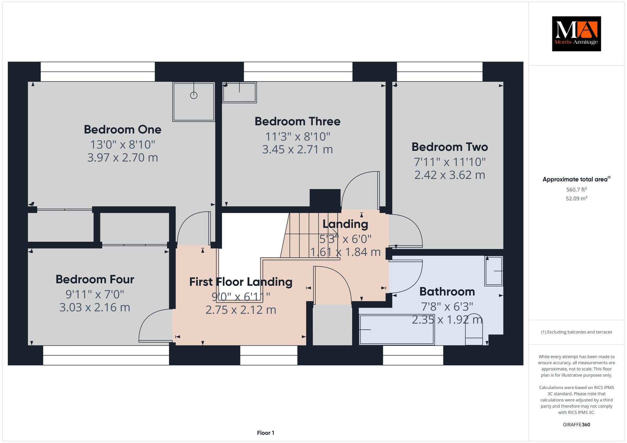 Bedroom Three 11’3” x 8’10” (3.45m x 2.71m)
