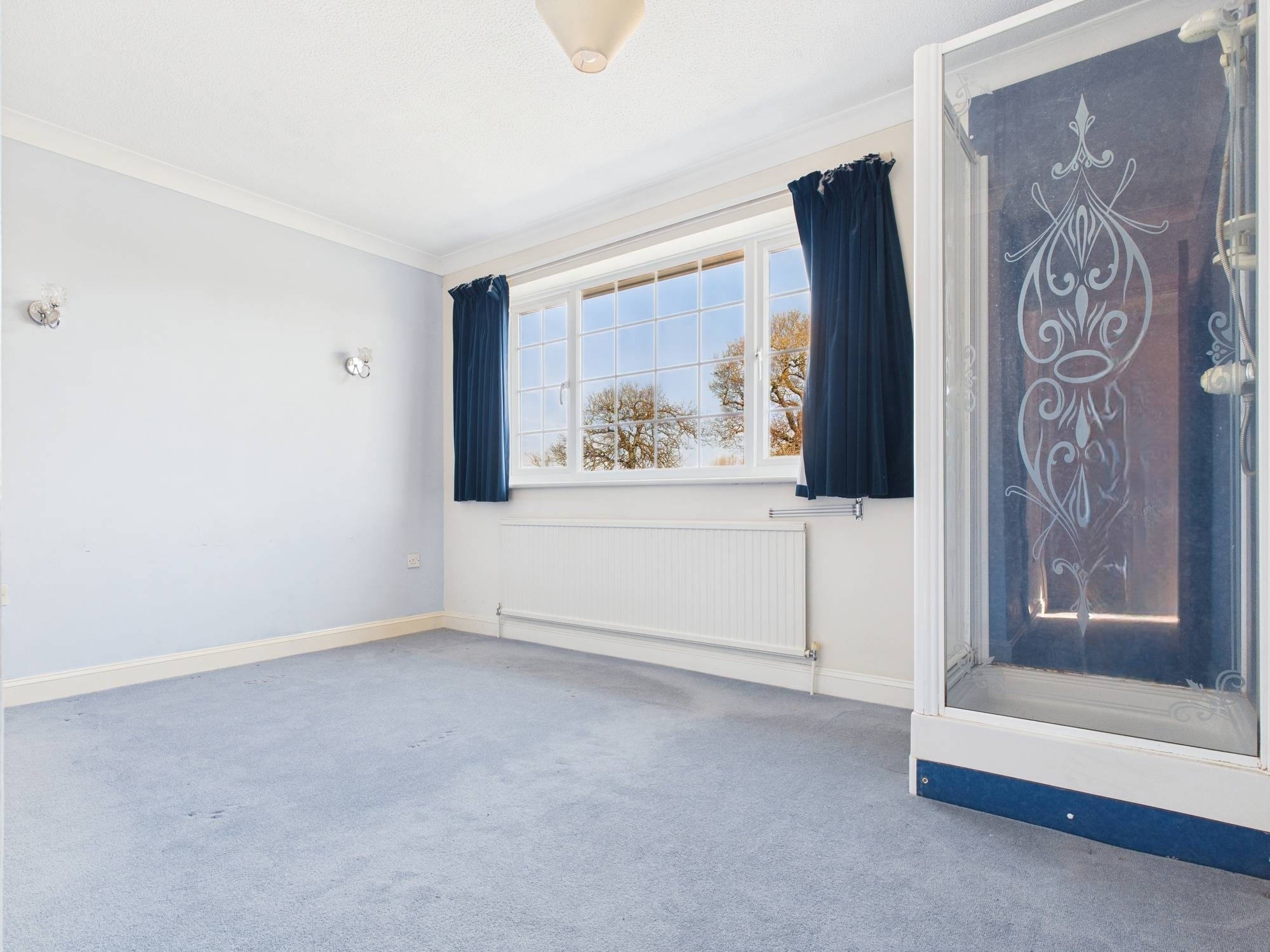 uPVC double glazed window to rear, wall mounted single panel radiator, doors to built in wardrobes, textured and coved ceiling, corner shower cubicle.