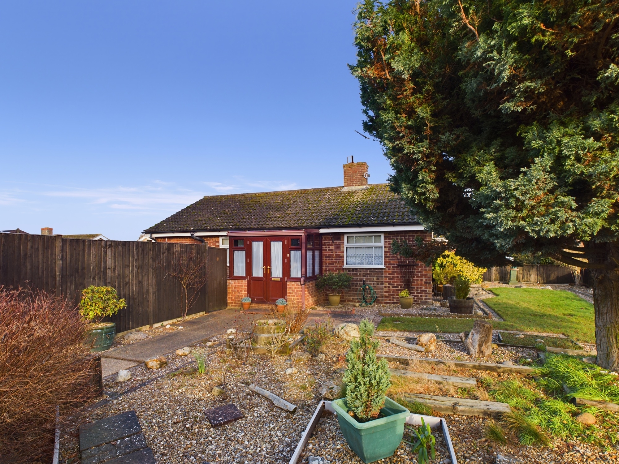 Sitting on a corner plot, to the front it is laid to a mixture of patio, shingle and lawn with a range of bushes and shrubs inset. A gate leads through to further garden areas which are low maintenance with wooden storage outbuildings and a greenhouse. A personal gate gives access to the private driveway which leads to the garage and an integral door leads to the side gardens.