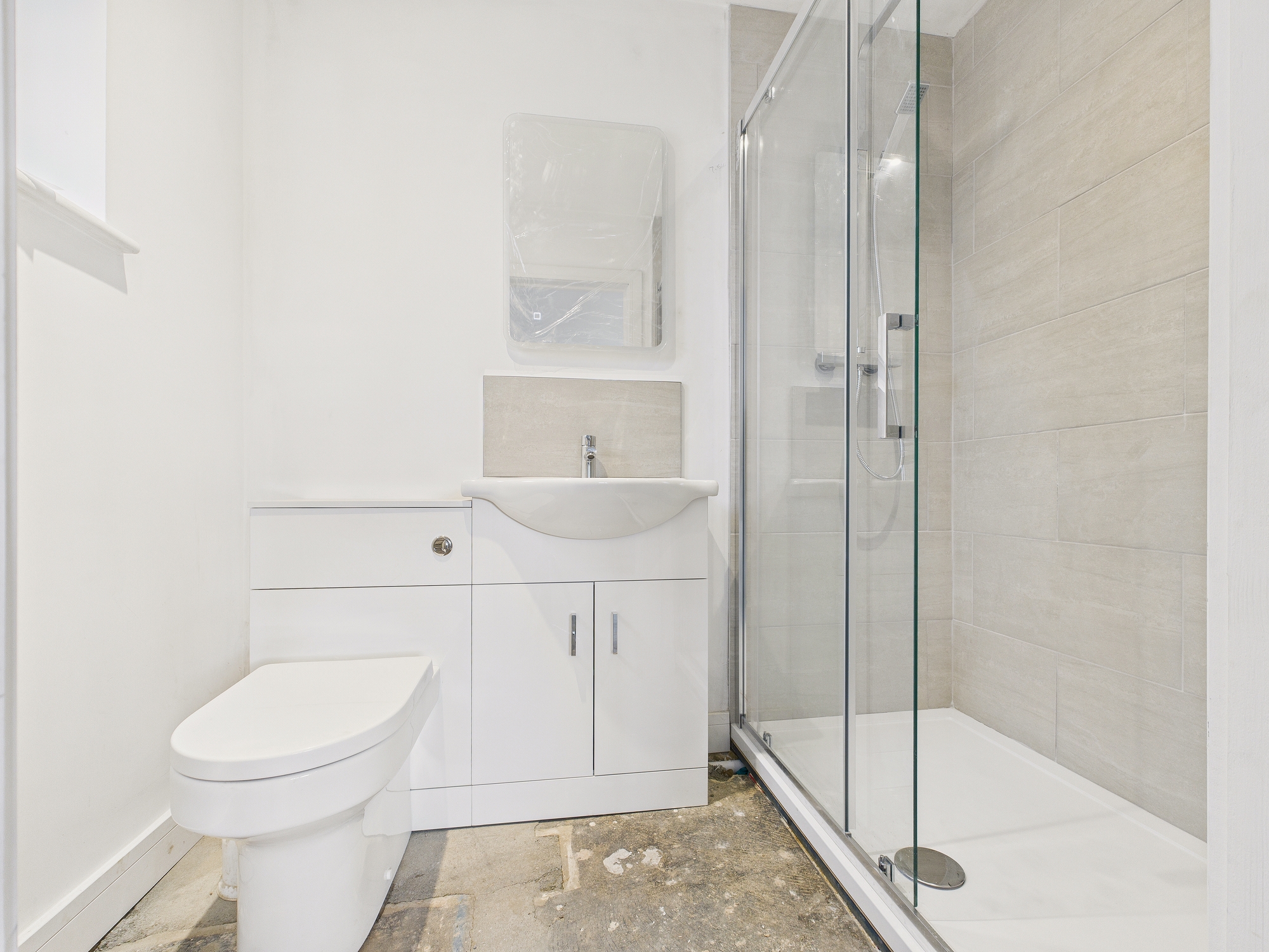 Upvc double glazed window to side, wall mounted heated towel rail, double shower cubicle with sliding glass door, concealed cistern WC and handwash basin inset to vanity unit, ceiling spotlights and extractor.