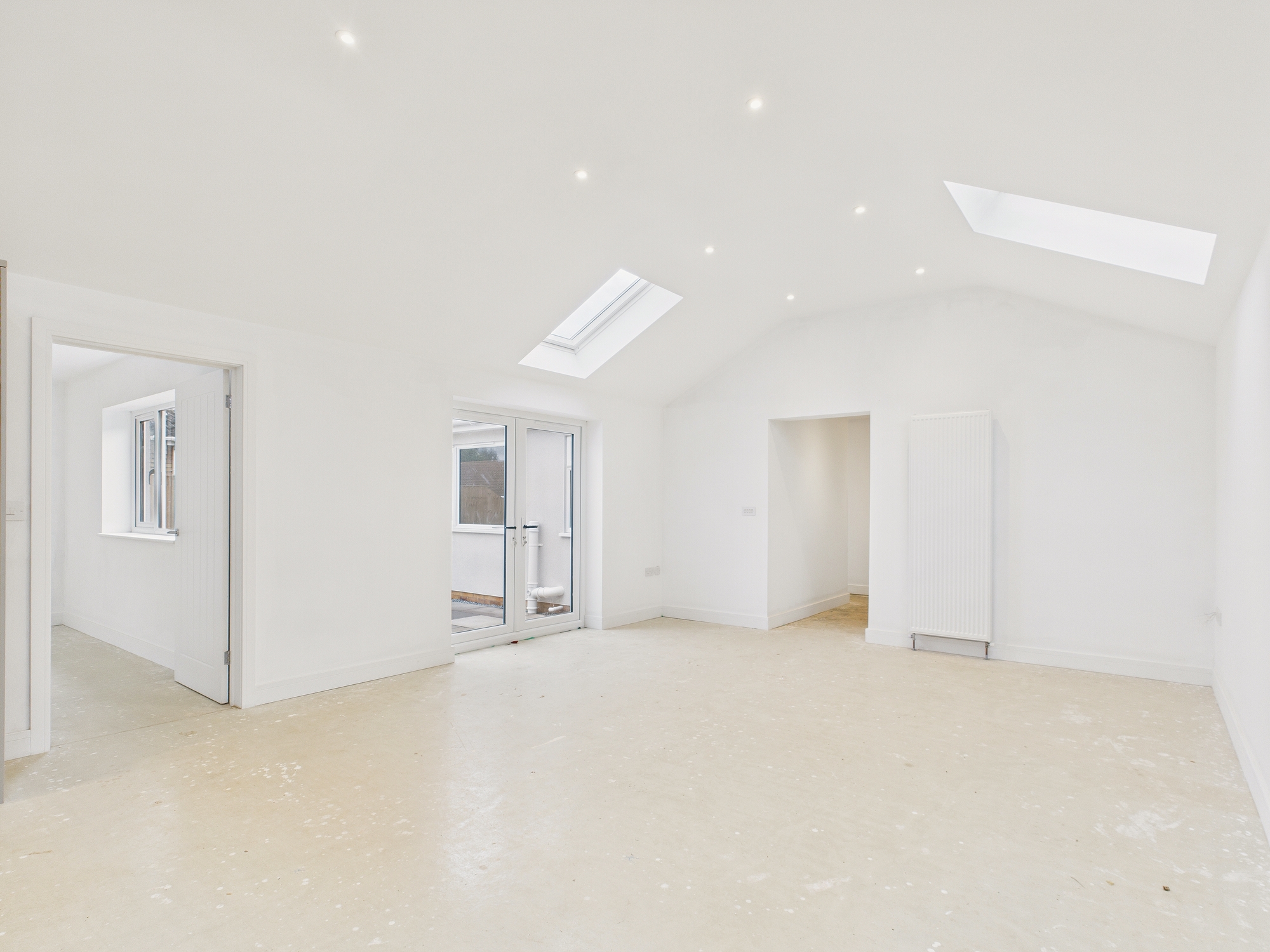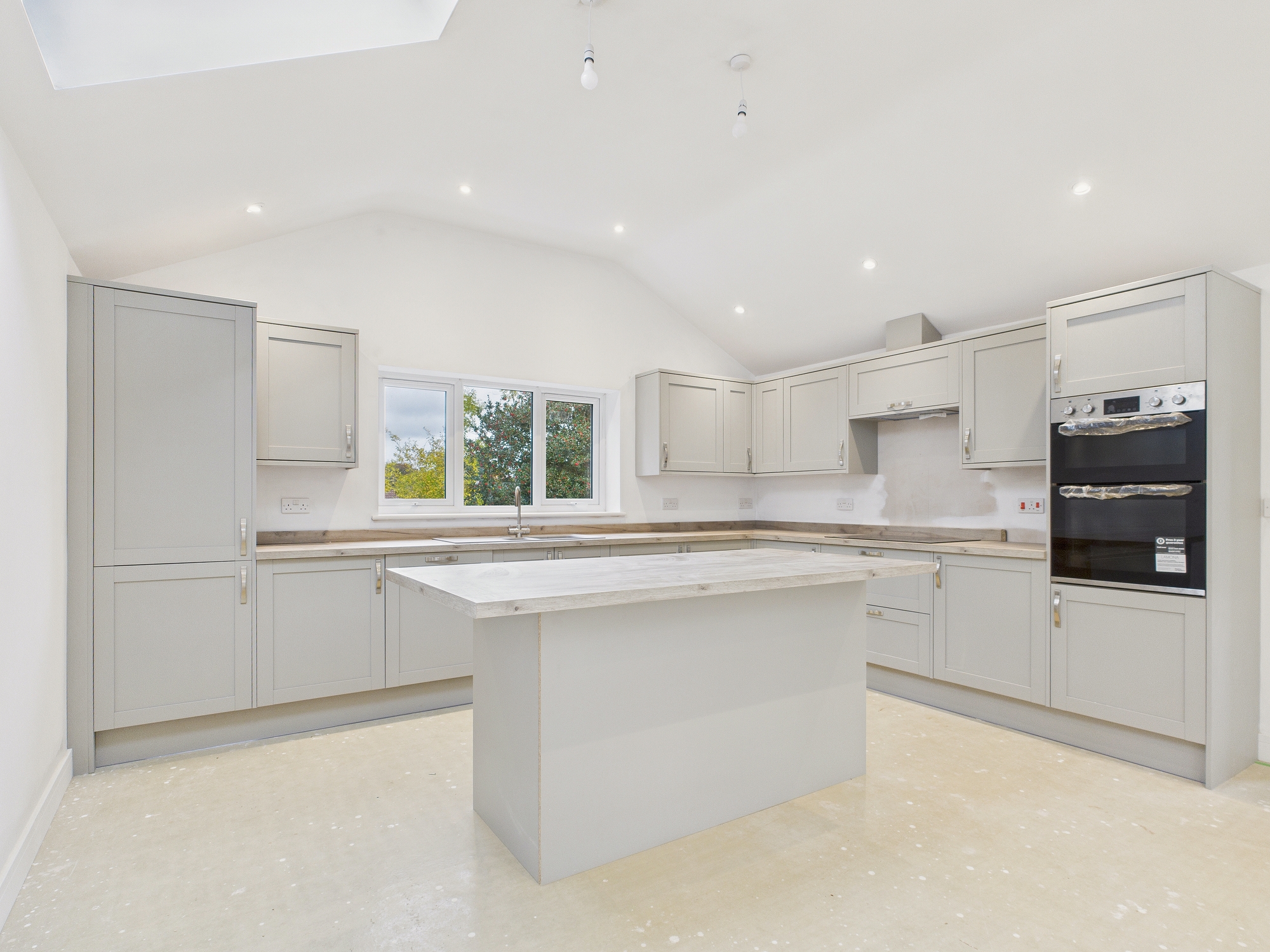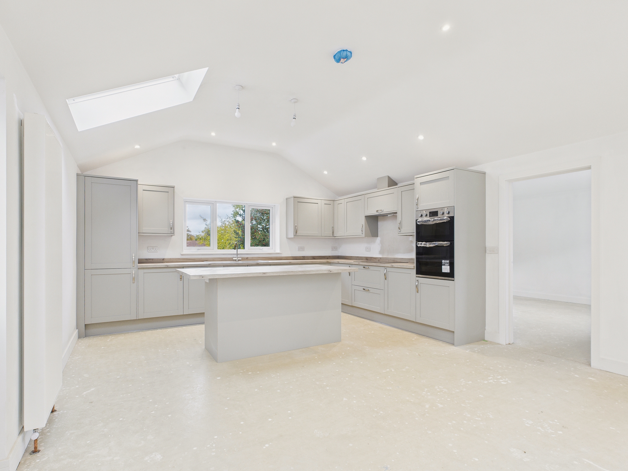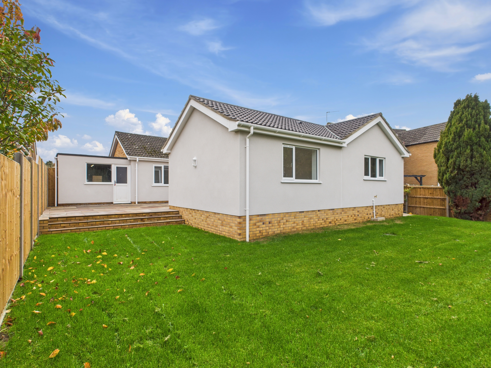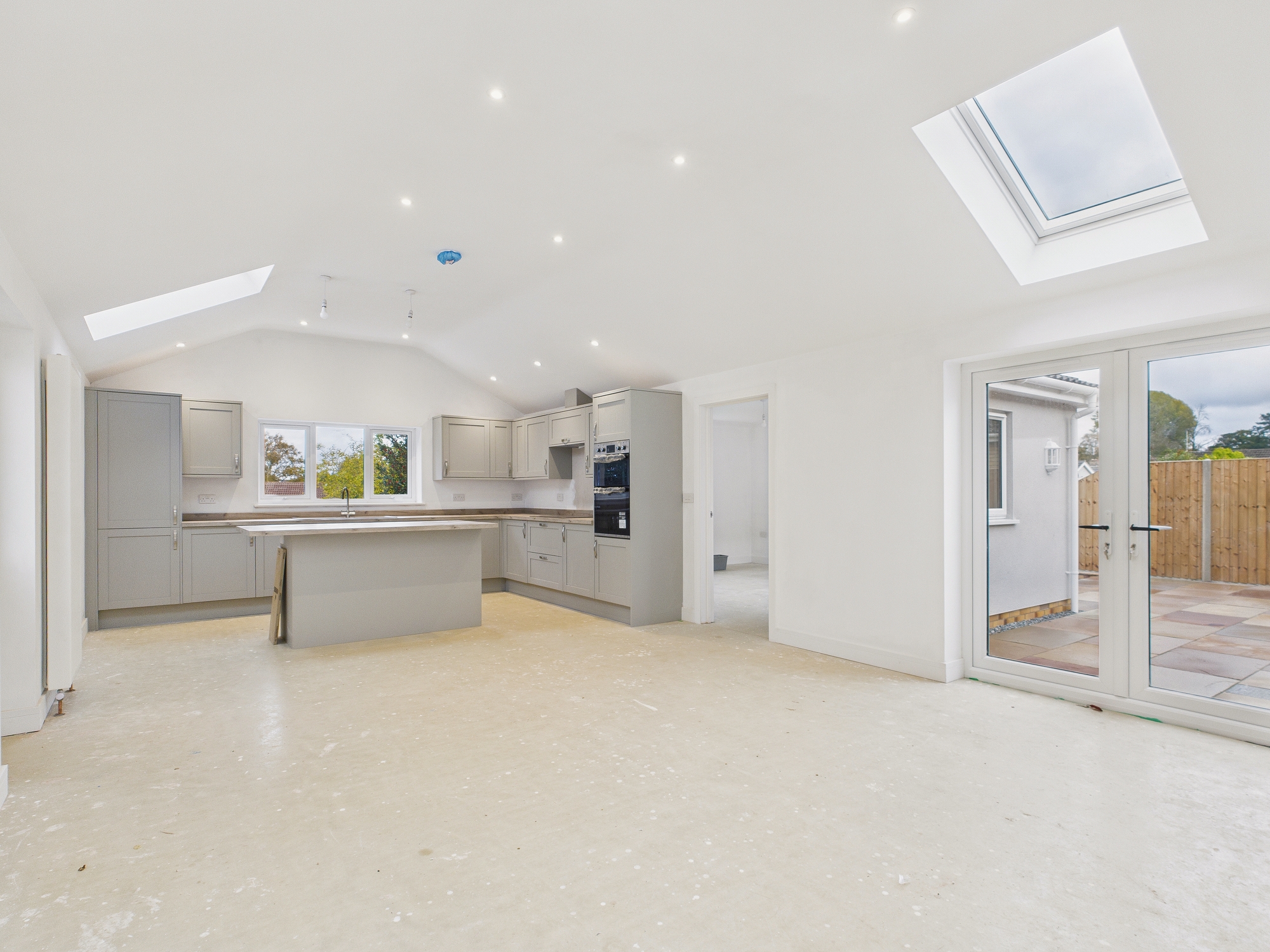 This beautifully reconfigured and extended detached bungalow offers an exceptional level of modern living, having undergone a complete transformation to create an enviable three-bedroom home of approximately 1,250 sq. ft. Situated within an established residential area, the property enjoys easy access to the town centre and train station. Now approaching completion, the home will be available to purchase with no onward chain. Inside, the accommodation has been thoughtfully redesigned to maximise light, space and flow. Each of the three bedrooms is generously proportioned, with the main bedroom extending beyond 15ft and benefitting from a contemporary en-suite shower room. To the rear, an impressive open-plan kitchen/dining room spans over 28ft and serves as the heart of the home. This striking space features a vaulted ceiling with roof windows, flooding the area with natural light, and double doors that open out to a private, landscaped patio—perfect for entertaining or relaxing outdoors. A separate sitting room with a dual aspect views provides a cosy retreat, while a useful utility area ensures practicality. Externally, the property continues to impress with a re-landscaped garden extending to the rear and a driveway to the front leading to a garage with electric door. Nearly every element of this bungalow has been renewed—from its layout and structure to the fixtures and finishes—creating a home that combines the character of an established setting with the benefits of a brand-new build.