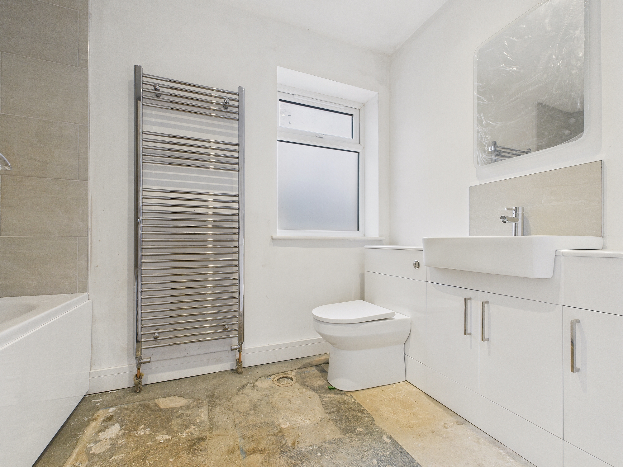 Upvc double glazed window to rear, wall mounted heated towel rail, panelled bath with mixer tap and shower over, tiled to surface, concealed cistern WC and handwash basin inset to vanity unit with wall mounted mirror over.