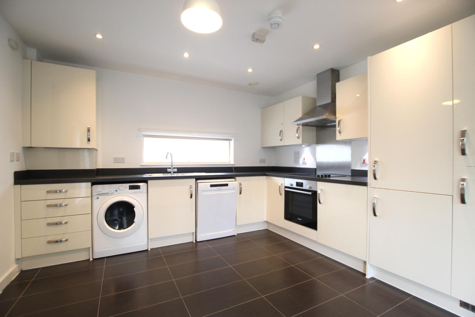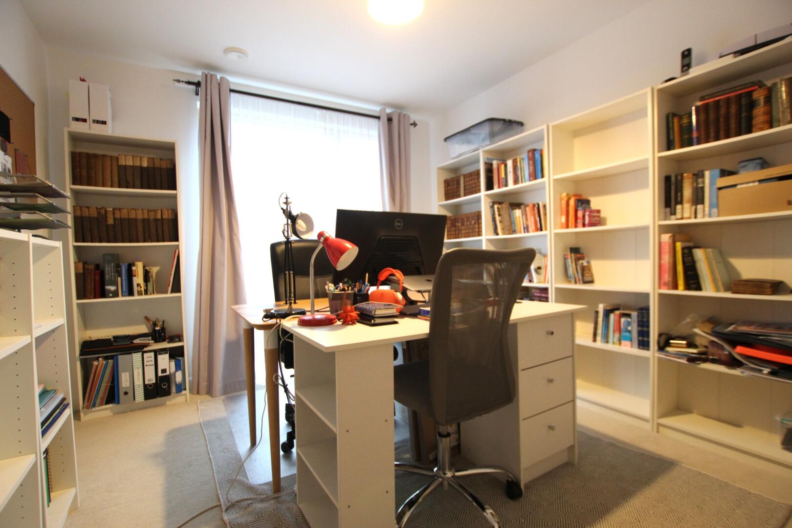 The property features a large open-plan living area which flows through to a modern fitted kitchen, complete with white goods. There are two double bedrooms, along with an additional storage room/study providing valuable extra space. The family bathroom is well appointed and includes both a bath with shower.