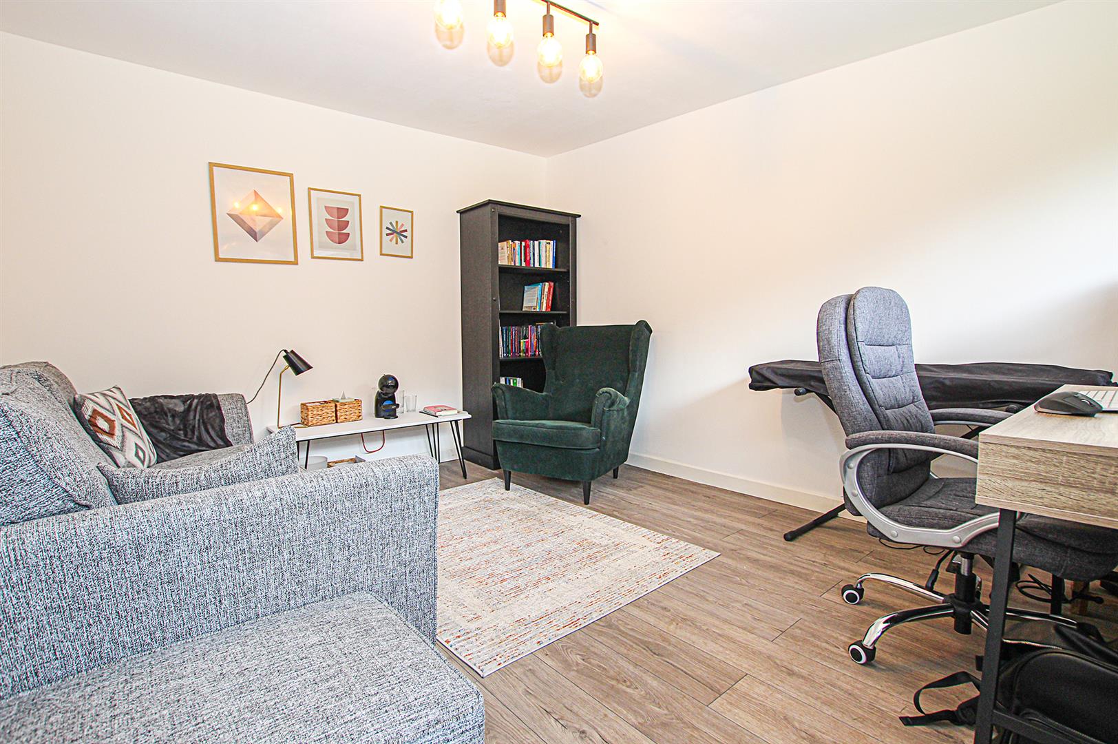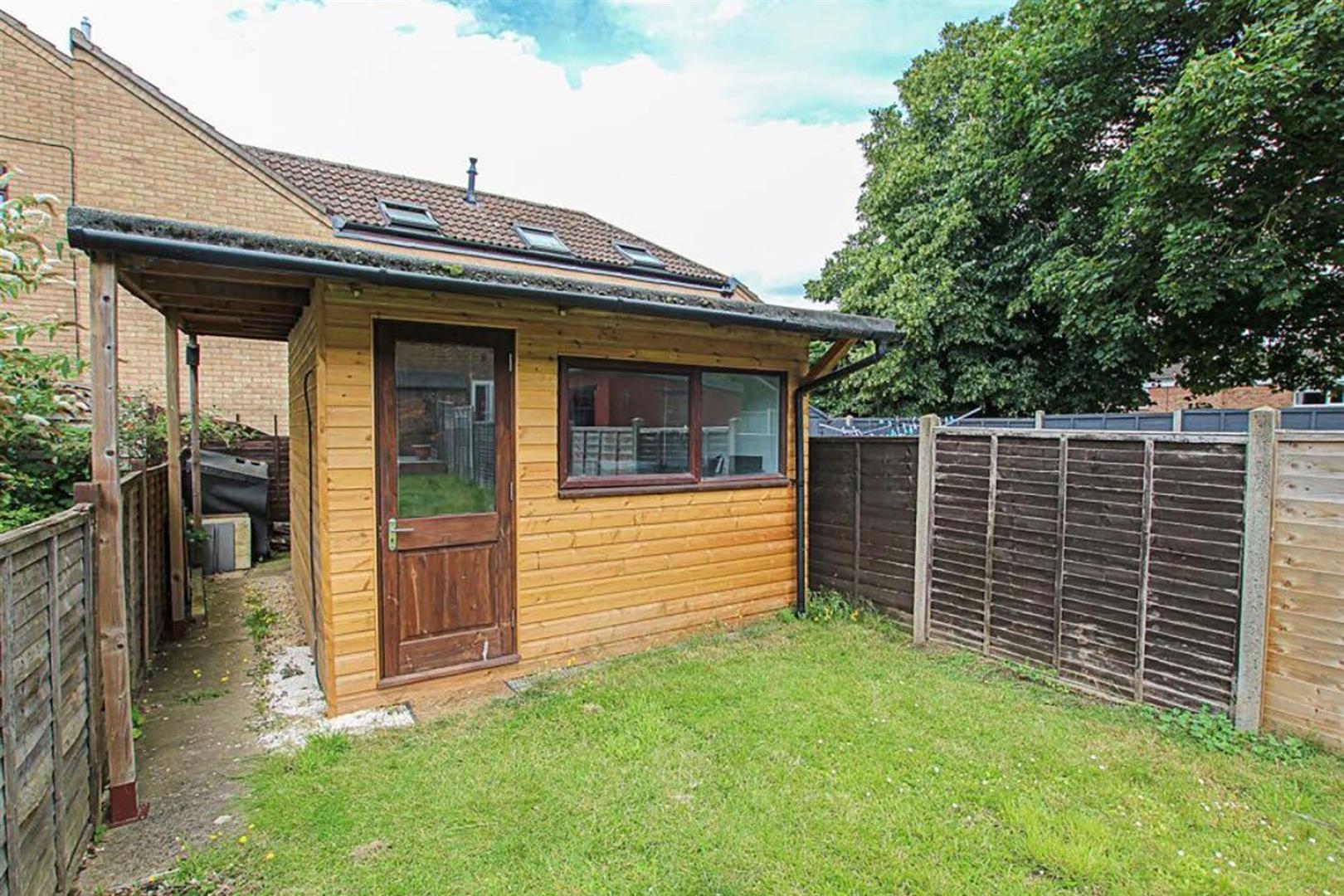 Fully enclosed rear garden predominantly laid to lawn with raised patio/seating area, substantial outside studio/office facilities with power and lighting connected, further storage shed, external storage area, gated side access, outside lighting.