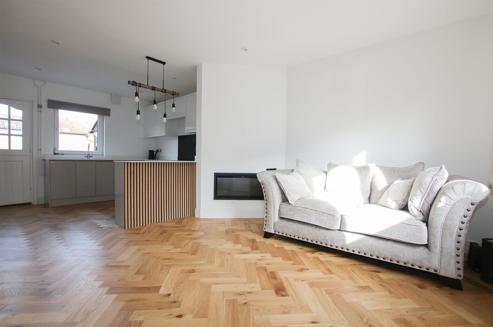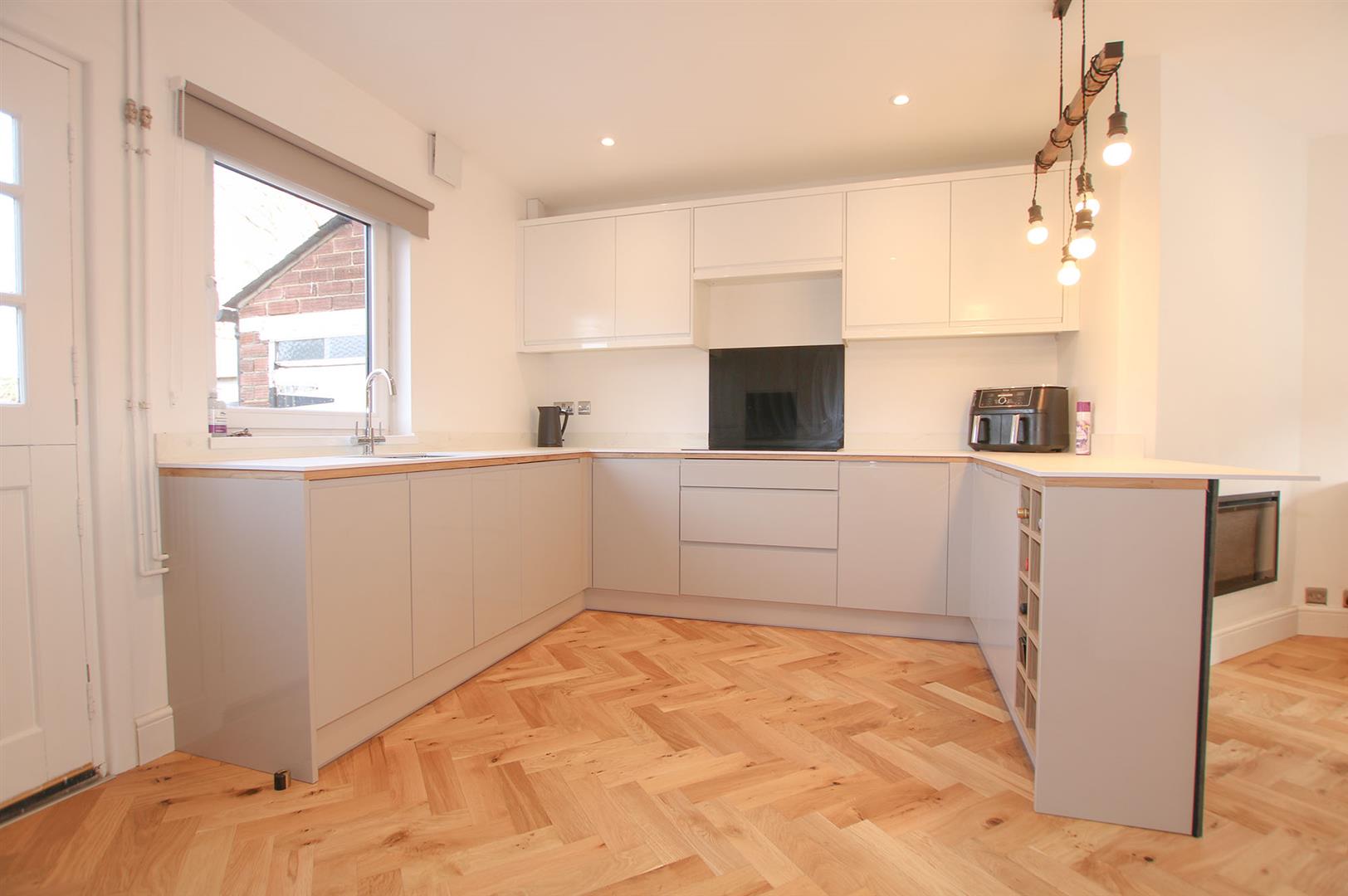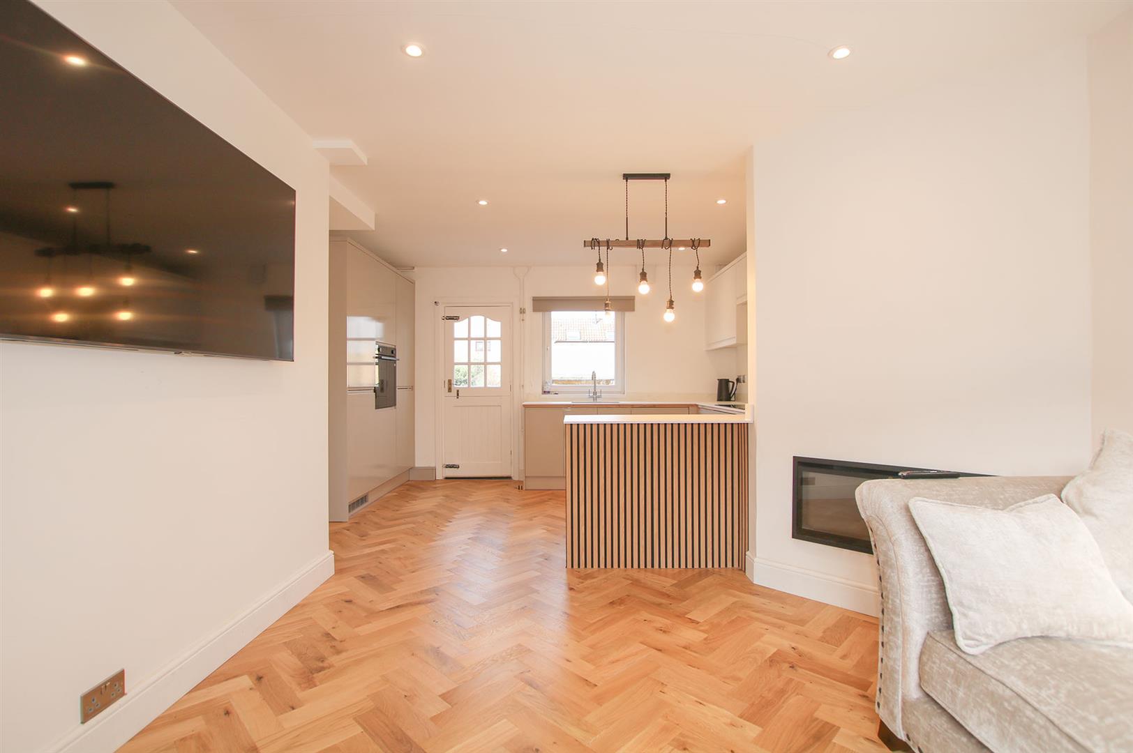 Open plan living space with recently refitted modern kitchen with a range of matching eye and base level storage units with work top surfaces over. Inset sink with mixer tap over. Intergraded oven, with separate hob. Integrated fridge/freezer, intergraded washing machine. Understairs storage cupboard. Window to rear aspect. Stable door leading to rear garden.
