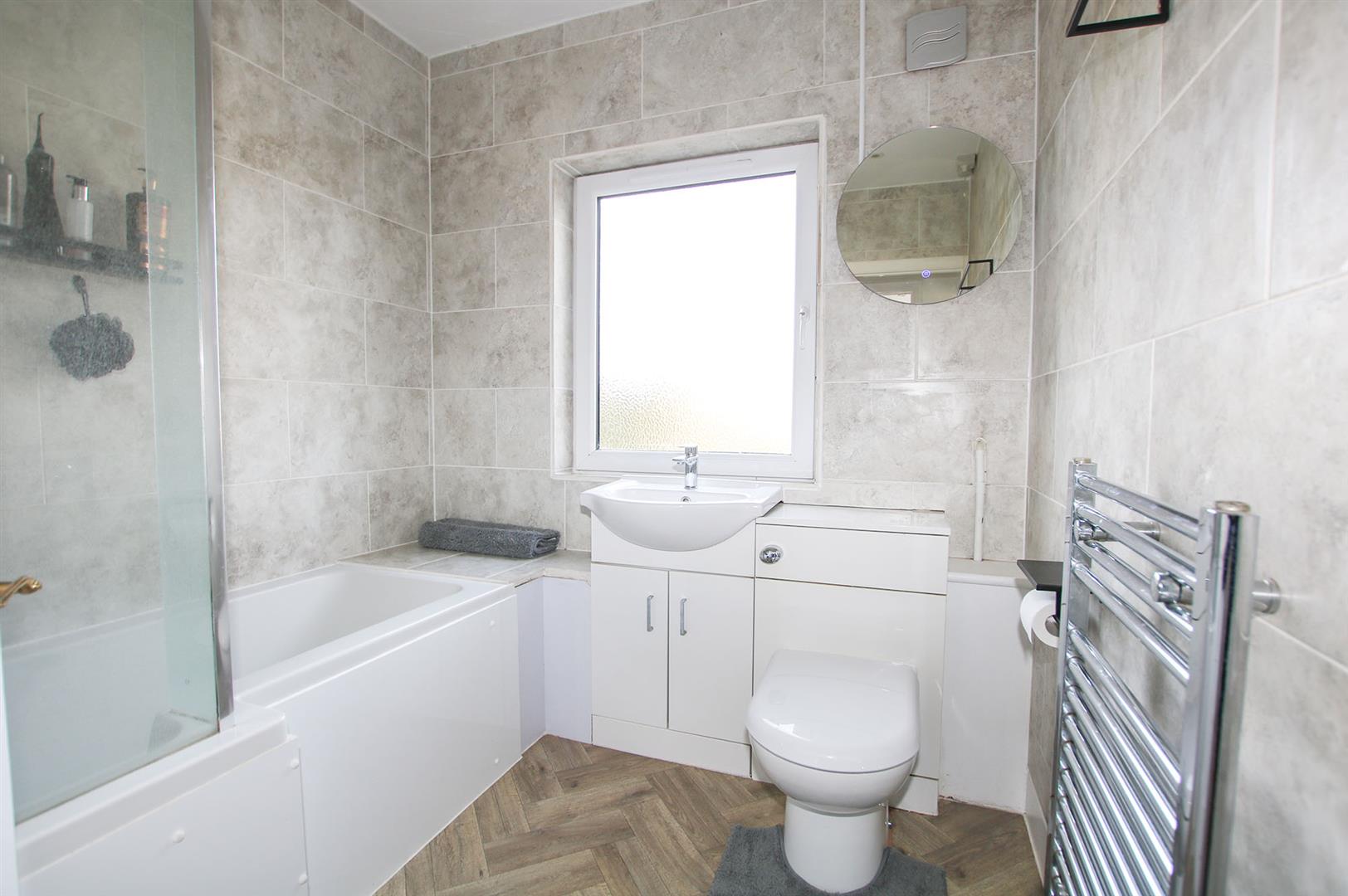 Suite comprising of bath with shower over, concealed cistern low level WC, vanity unit with sink over. Heated towel rail. Obscured window to rear aspect.