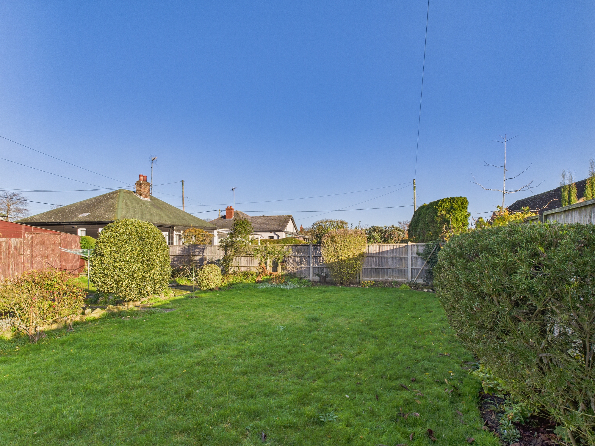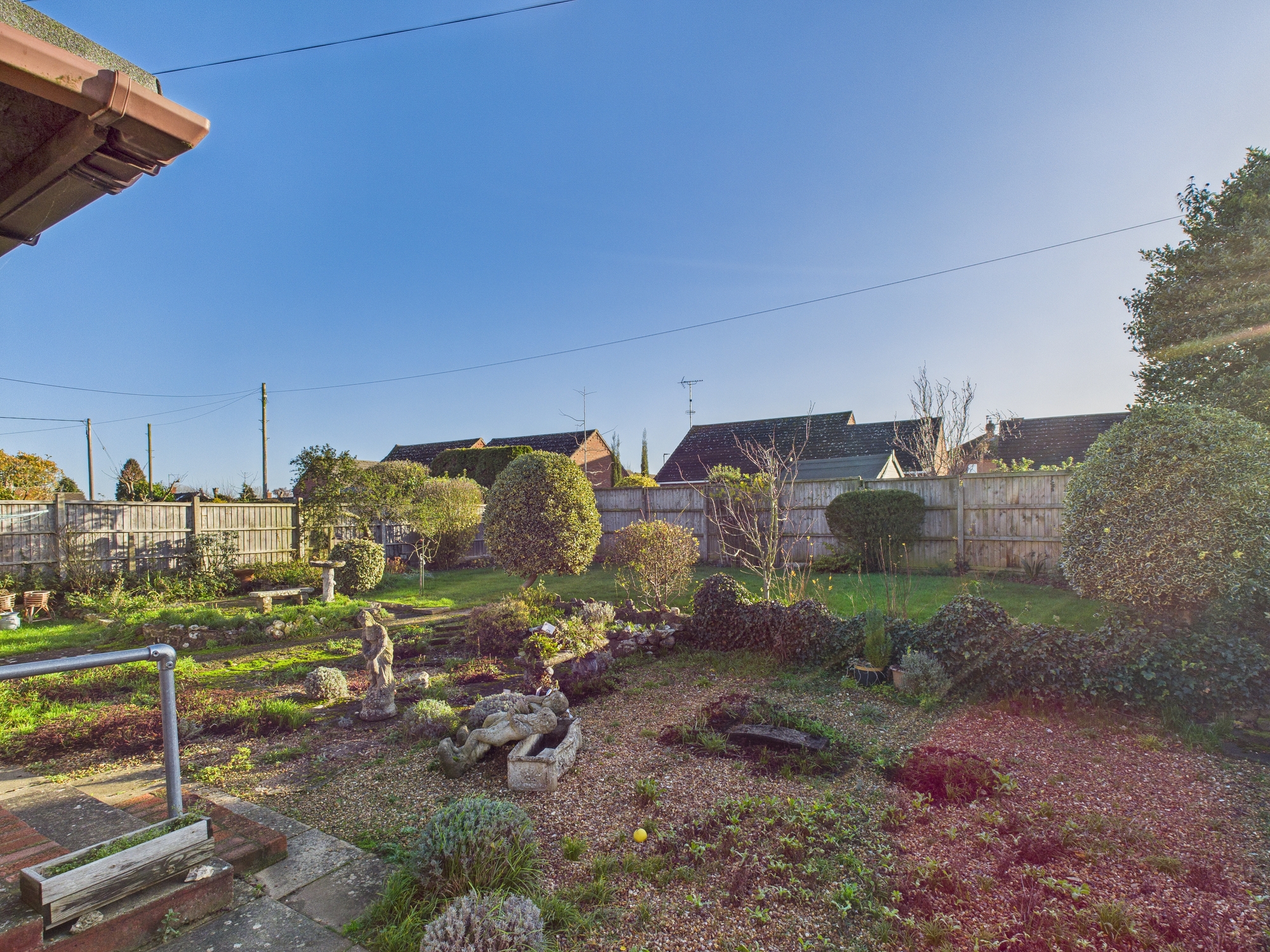 The front of the property is laid to shingle with a concrete driveway providing off road parking and leads to the wooden garage with double doors. The rear garden is south facing and laid to lawn with a range of mature bushes and shrubs inset and to borders.
