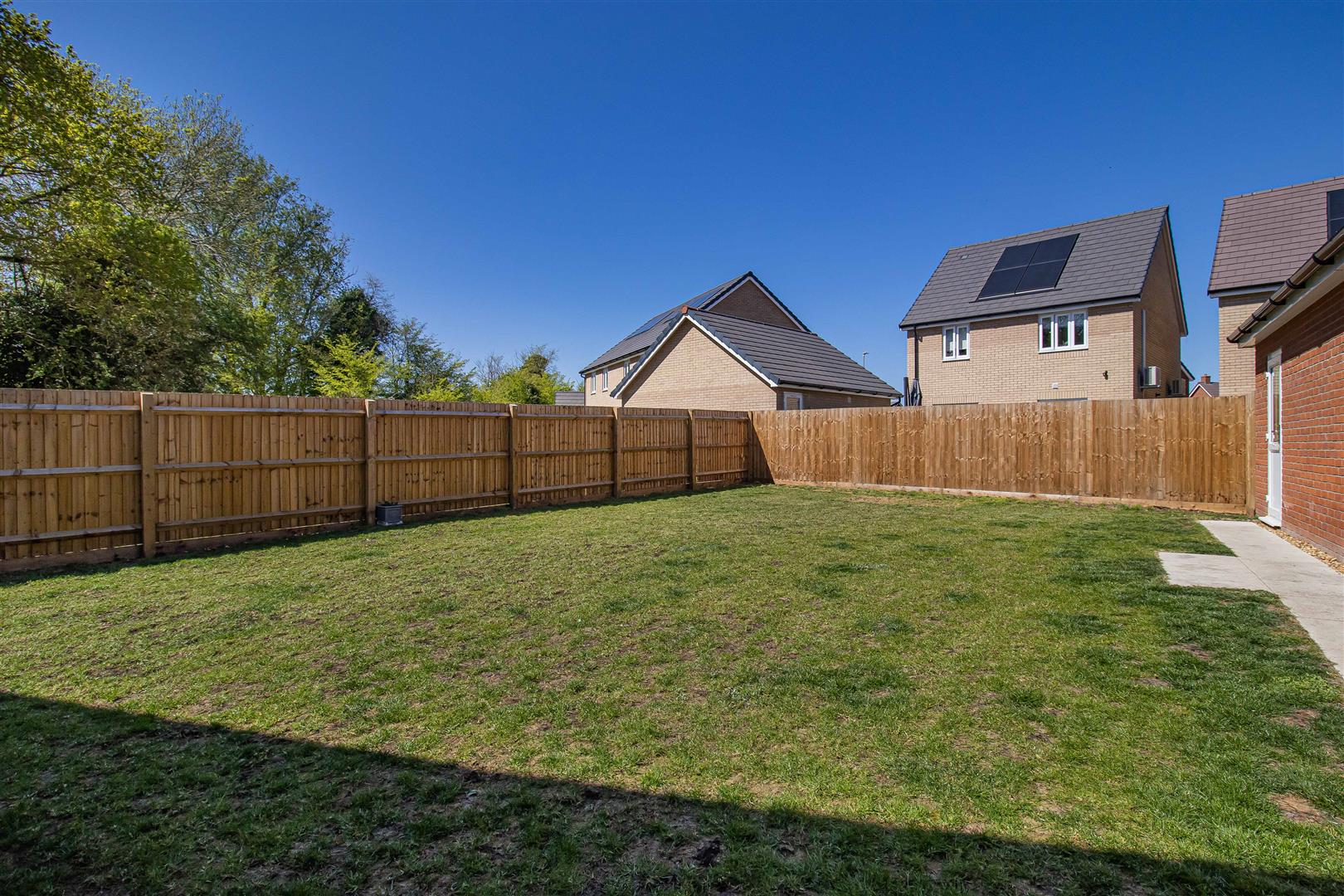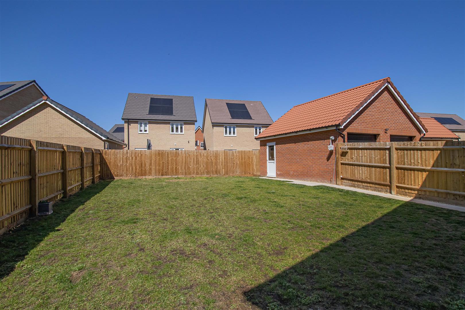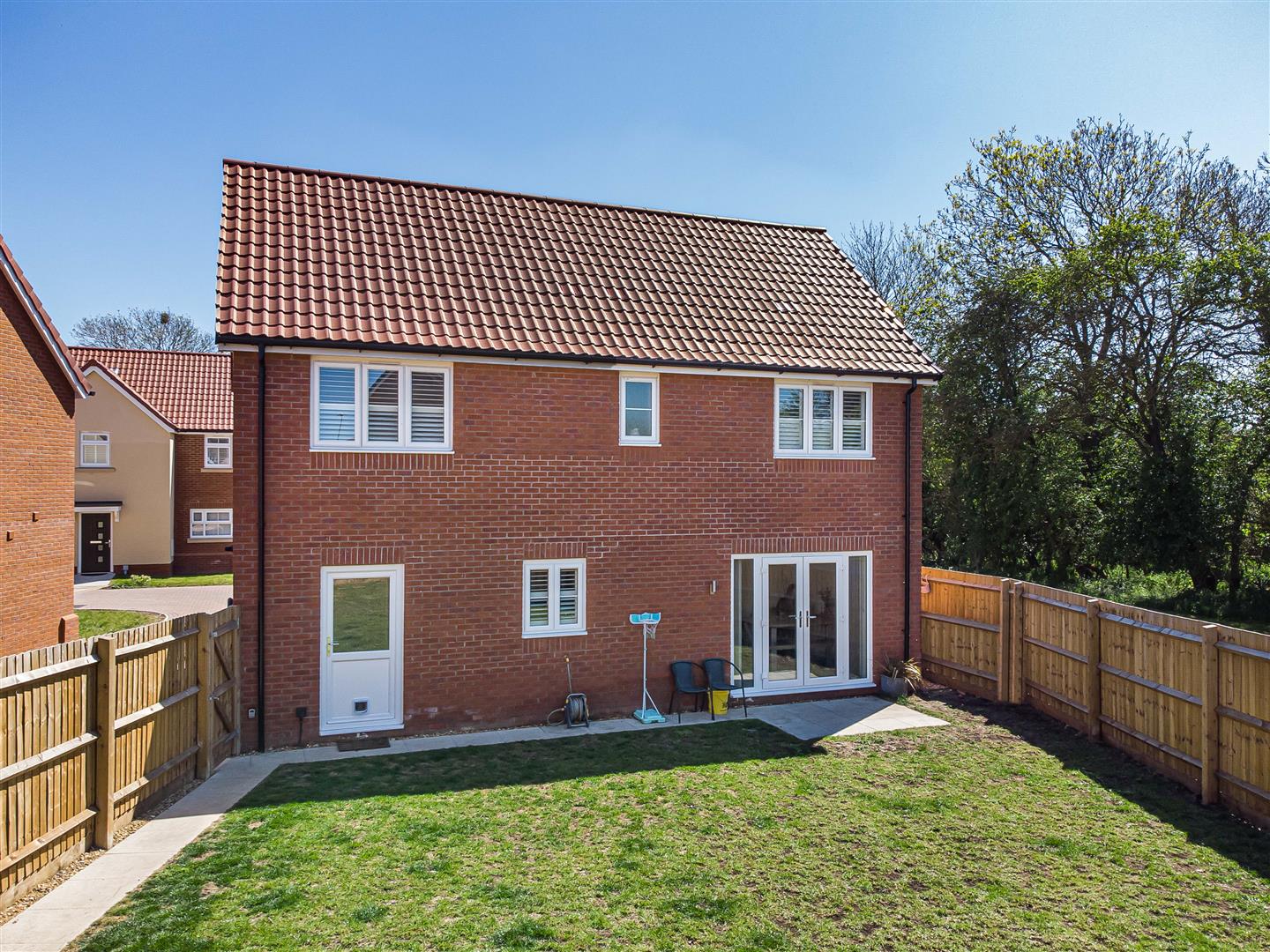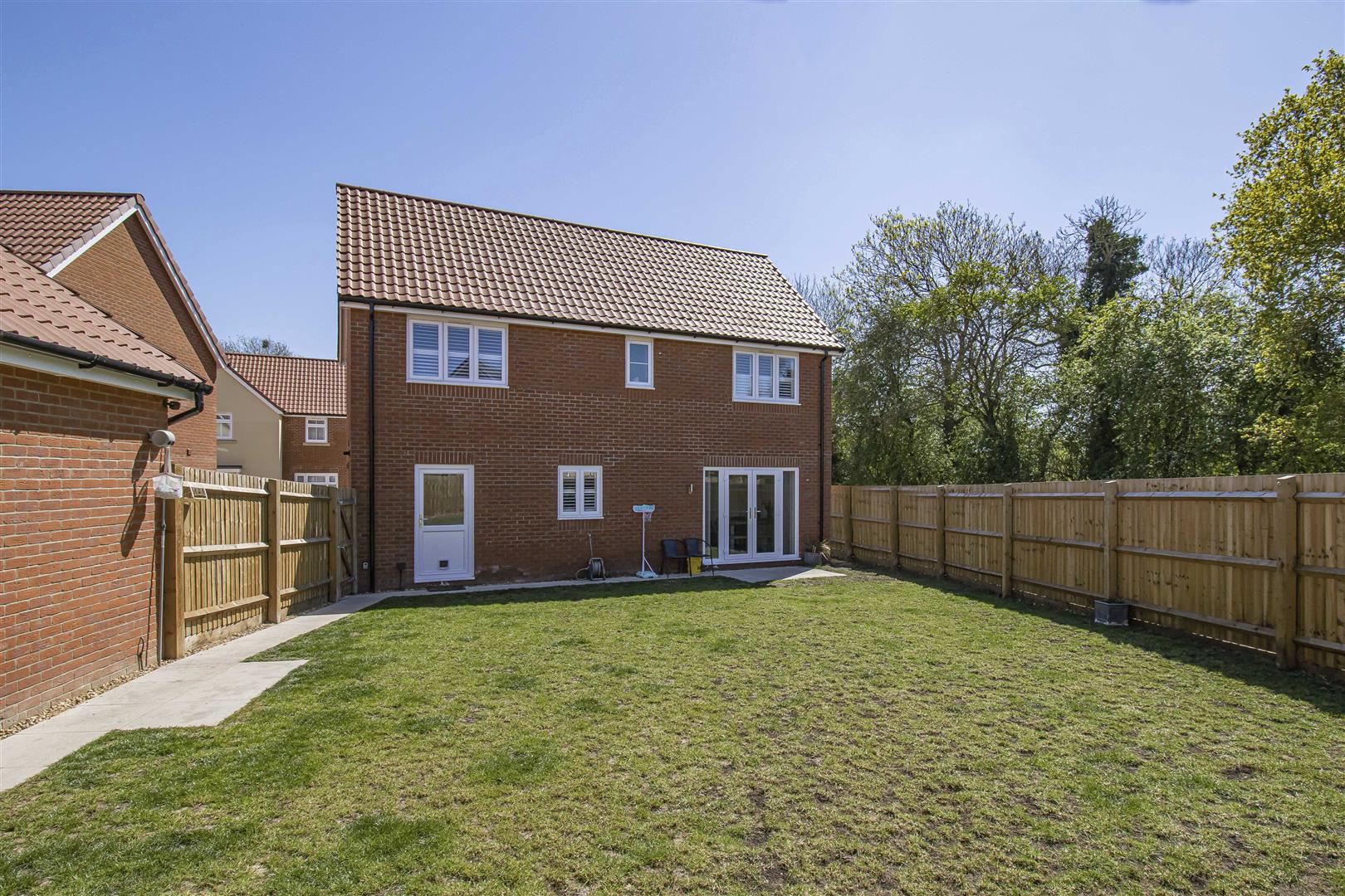 Patio area to the rear of the house with french doors leading to the kitchen/dining room. Paved side path leading to the rear of the garden and pedestrian door to the double garage. Laid to lawn. Access gate to the front.