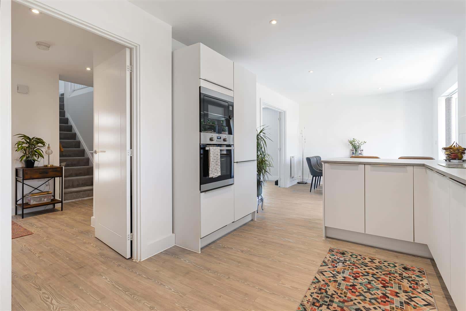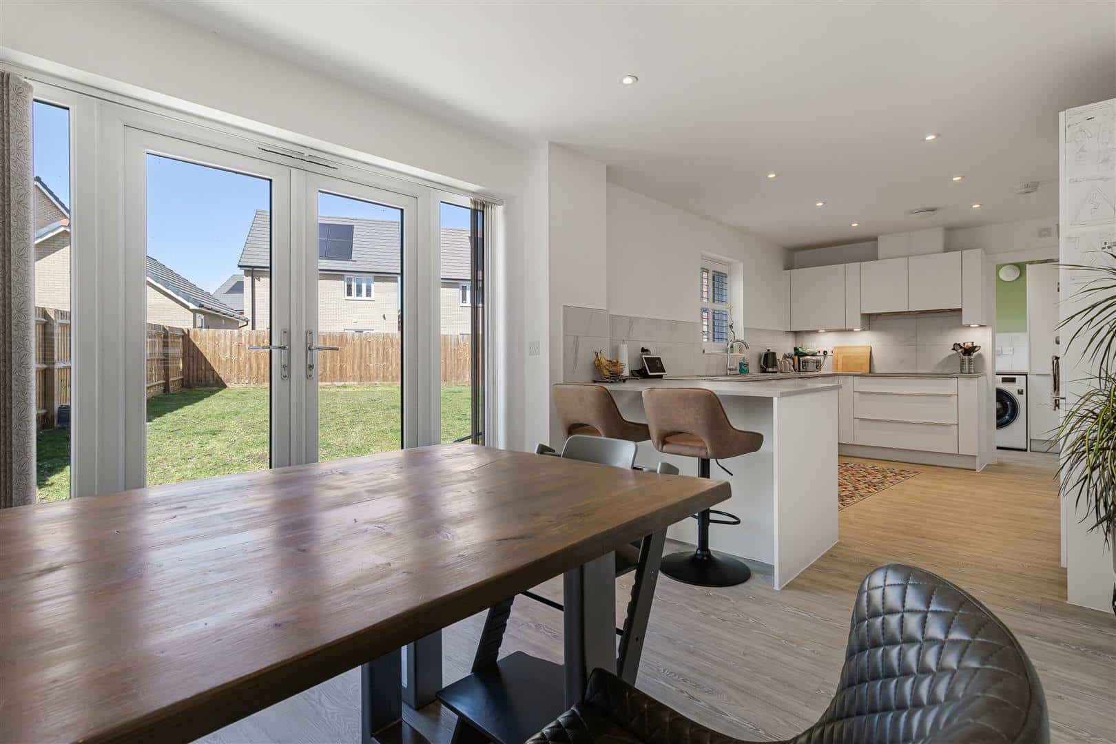 Stunning, sleek fitted kitchen with a range of high gloss eye and base level cupboards and storage drawers with composite worktop over, incorporating breakfast bar seating. Stainless steel 1 1/3 bowl sink and drainer with mixer tap over. Integrated, eye level AEG oven and microwave. Integrated fridge/freezer and dishwasher. Spacious dining area. Luxury LVT wood flooring throughout. Radiators. Window to the rear aspect. French doors leading to the patio area. Double doors leading to the living room. Doors leading to the utility room and entrance hall.