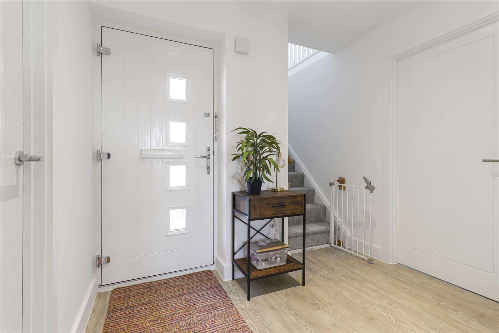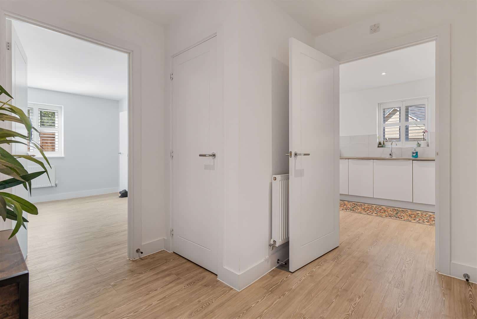 Spacious, light hallway with LVT wood flooring. Doors leading to the kitchen/dining room, living room, study and cloakroom. Built-in storage cupboards. Radiator. Stairs leading to the first floor landing.