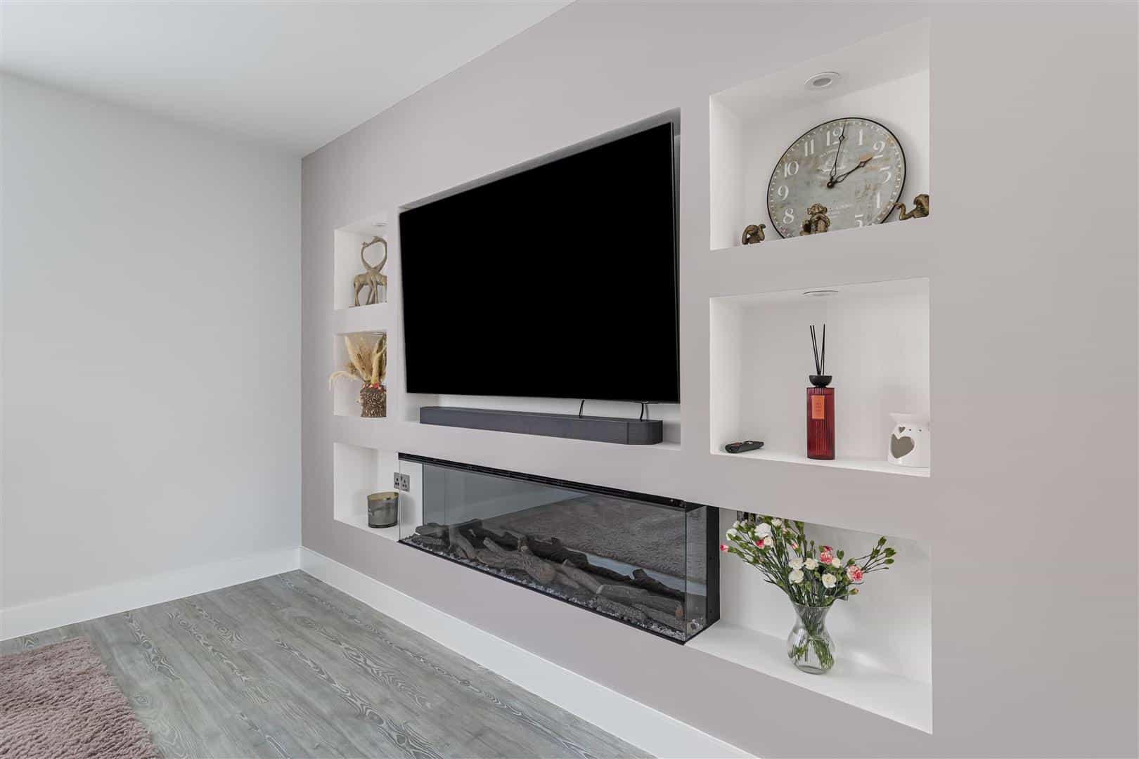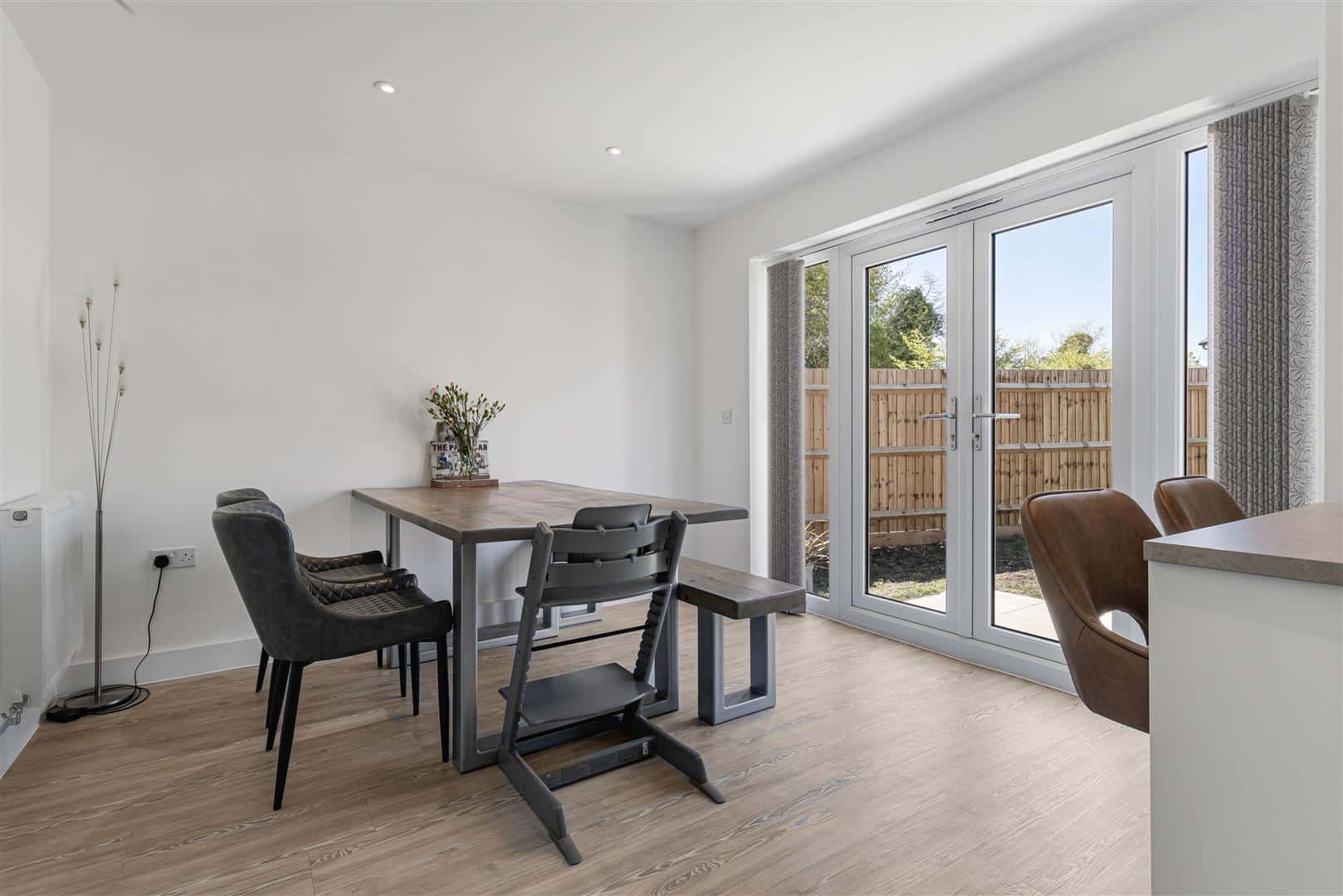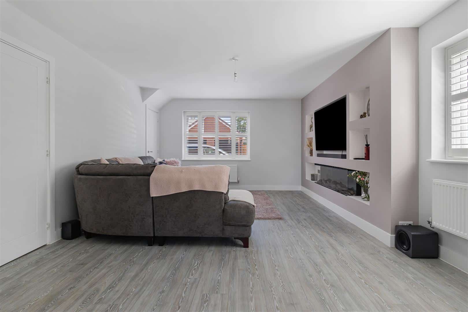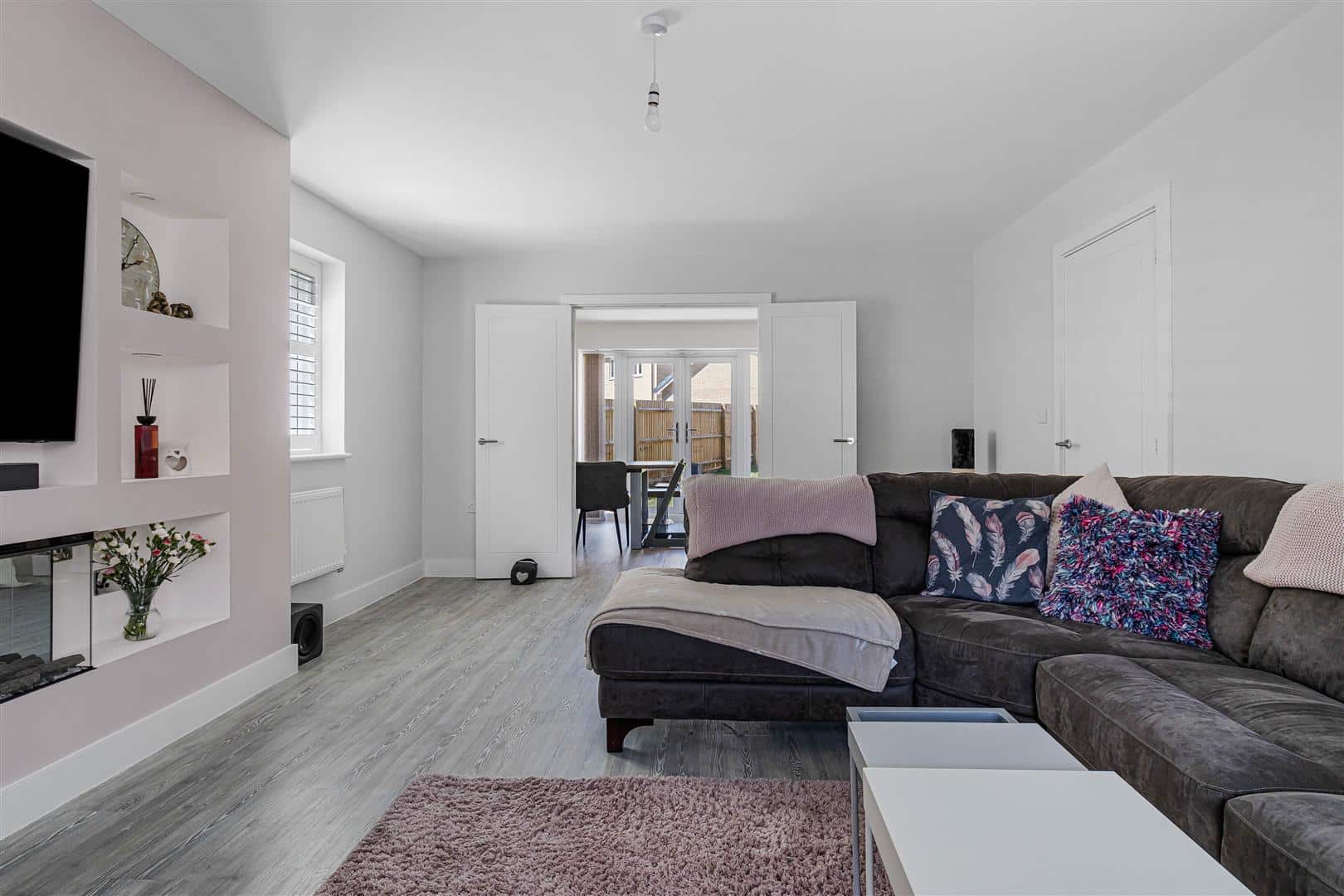 Contemporary, well presented living room with dual aspect windows. Built-in media wall fitted with inset log effect fireplace. Radiators. Luxury LVT wood flooring. Double doors leading to the kitchen/dining room. Door leading to the entrance hall.