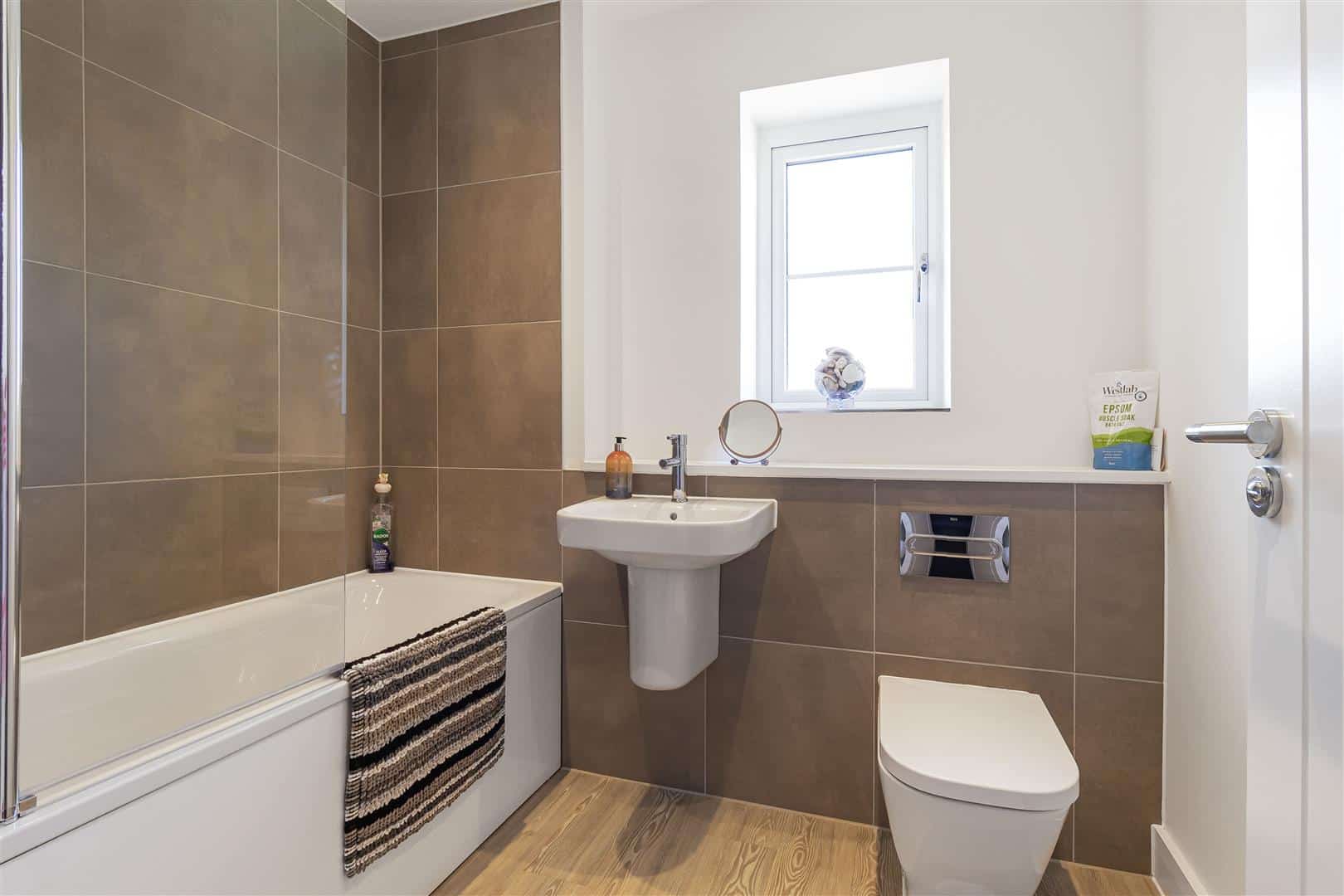 Contemporary white suite comprising low level, concealed cistern, WC, wall mounted handbasin with mixer tap over and panelled bath with wall mounted shower over. Attractively tiled to wet areas. LVT wood flooring. Obscured window. Door leading to the landing.