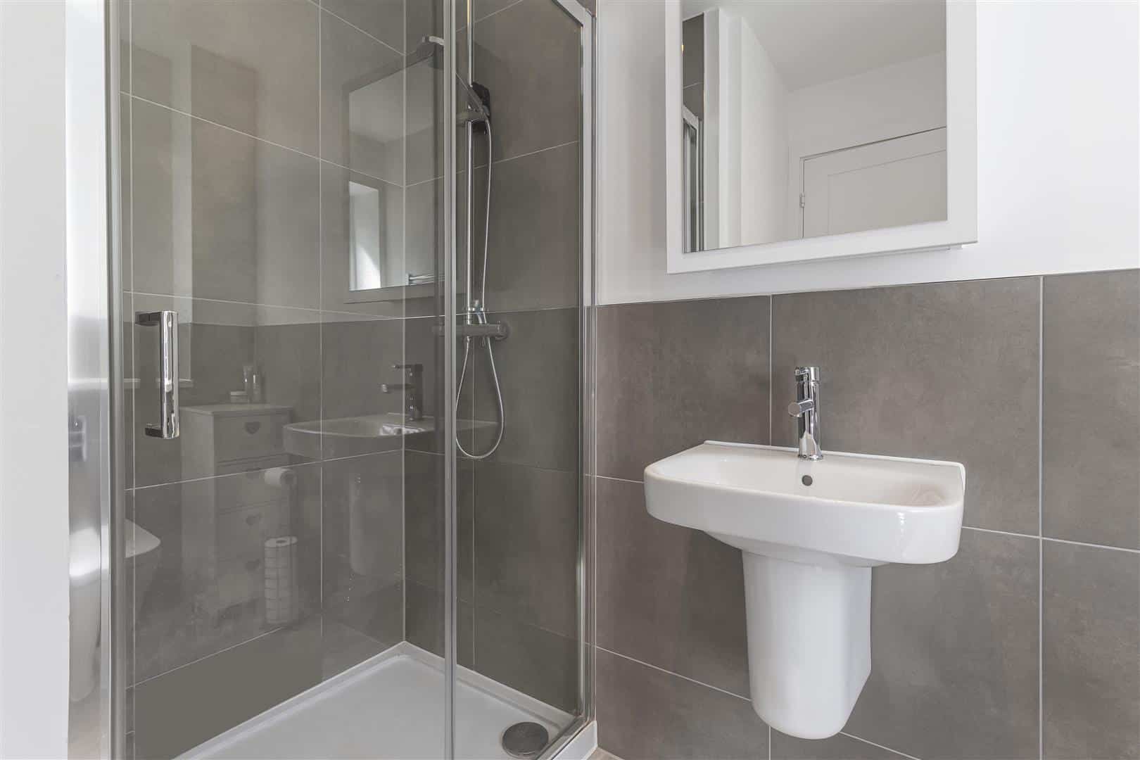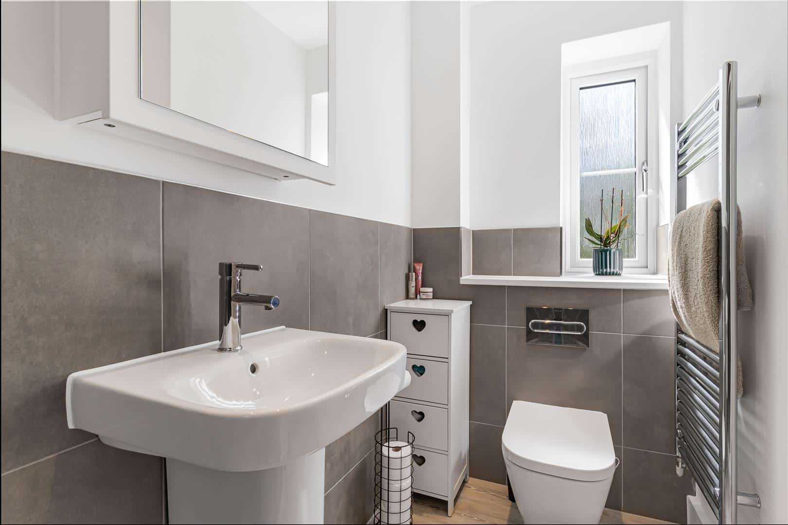 Contemporary white suite comprising low level, concealed cistern, WC, wall mounted handbasin with mixer tap over and generous walk-in shower. Attractively tiled to wet areas. Ladder radiator. LVT wood flooring. Obscured window. Door to the Master bedroom.