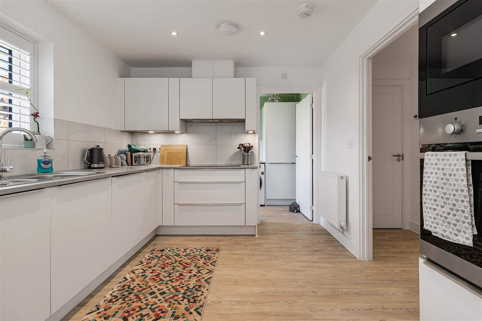A a range of fitted base level cupboards with composite worktop over. Further fitted upright storage cupboard. Stainless steel 1 1/3 bowl sink with drainer and mixer tap over. Space and plumbing for washing machine. LVT wood flooring. Radiator. Half glazed door to the rear garden. Door to the kitchen/dining room.