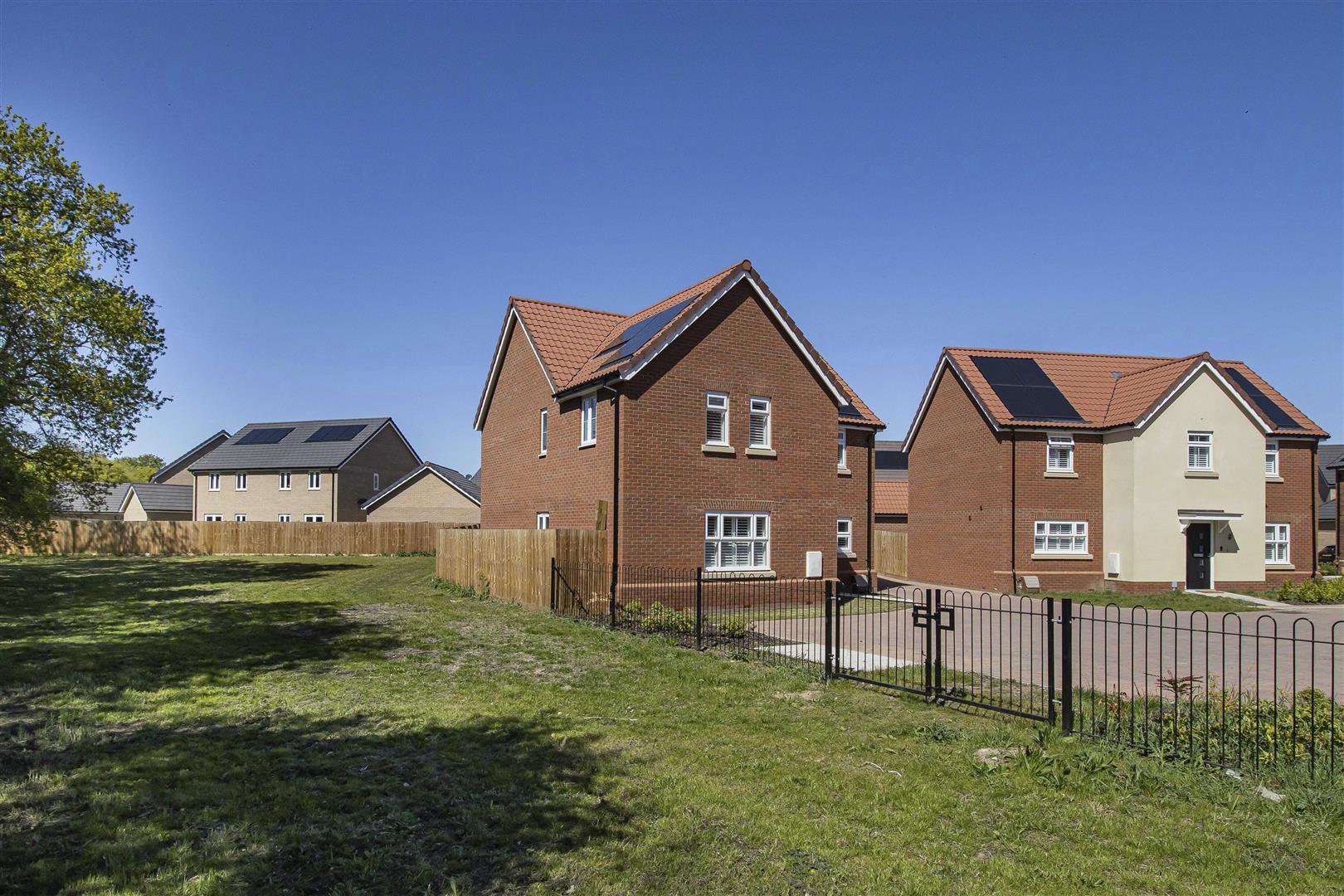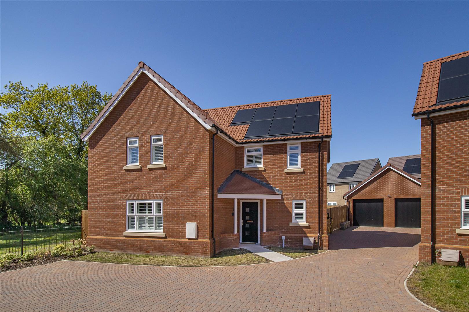 Block paved driveway leading to the double garage, providing off road parking. EV charging point. Lawned areas with pathway leading to the front door with storm porch over. Access gate to the rear garden.