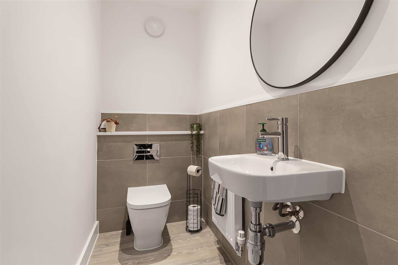 Contemporary white suite comprising low level, concealed cistern, WC and wall mounted handbasin with mixer tap over. Attractively tiled to wet areas. LVT wood flooring. Radiator. Door leading to the entrance hall.