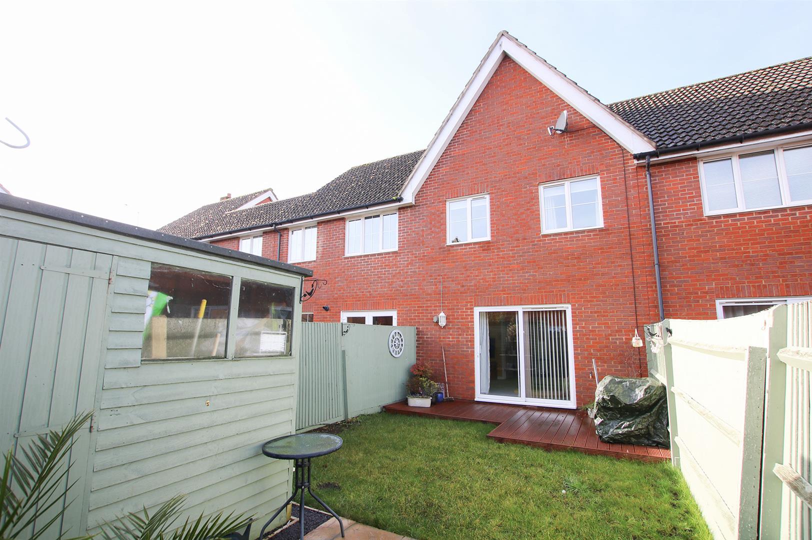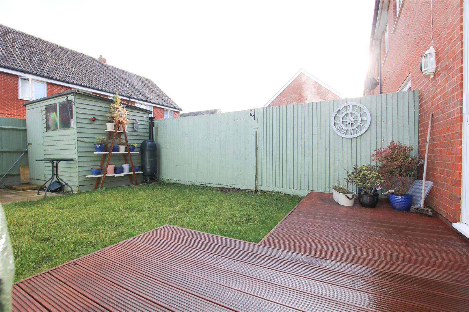 Fully enclosed rear garden predominantly laid to lawn with a variety of plants/shrubs, paved patio area, outside lighting, pathway leading to the rear with gated access. Timber shed with power and light.