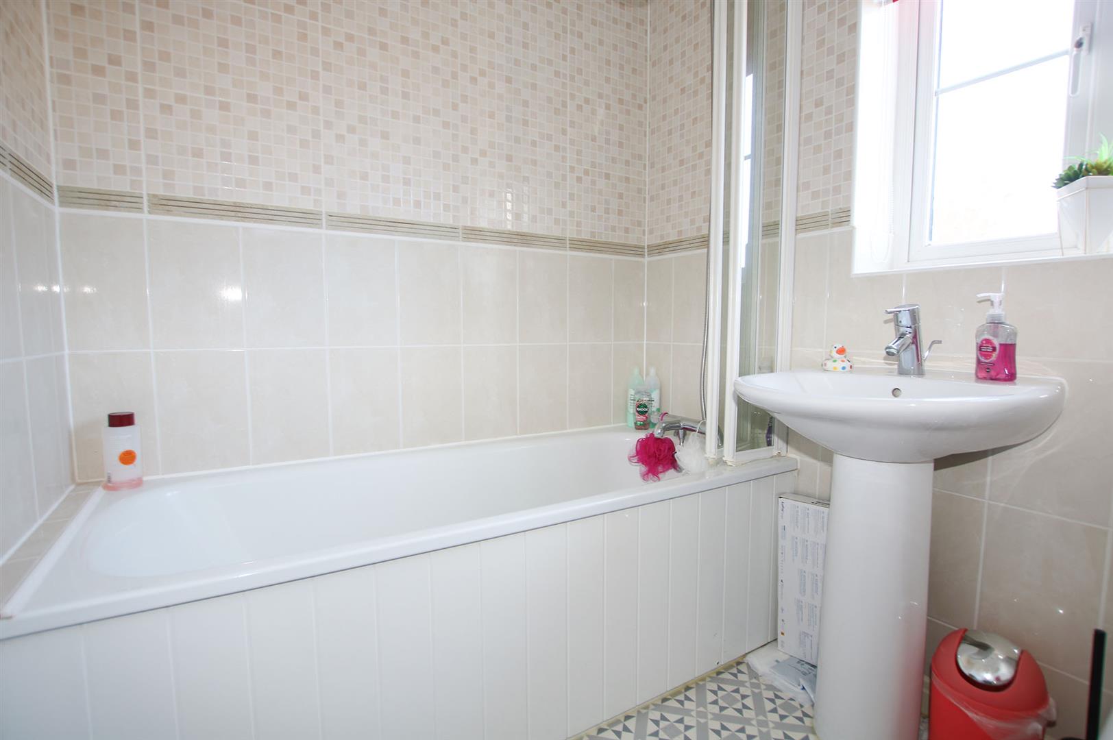 Family bathroom with suite comprising panel bath with shower over and concertina screen, low level WC, wash hand basin, tiled walls, tiled flooring, shaver point, extractor fan, radiator window with obscured glass to the front aspect.