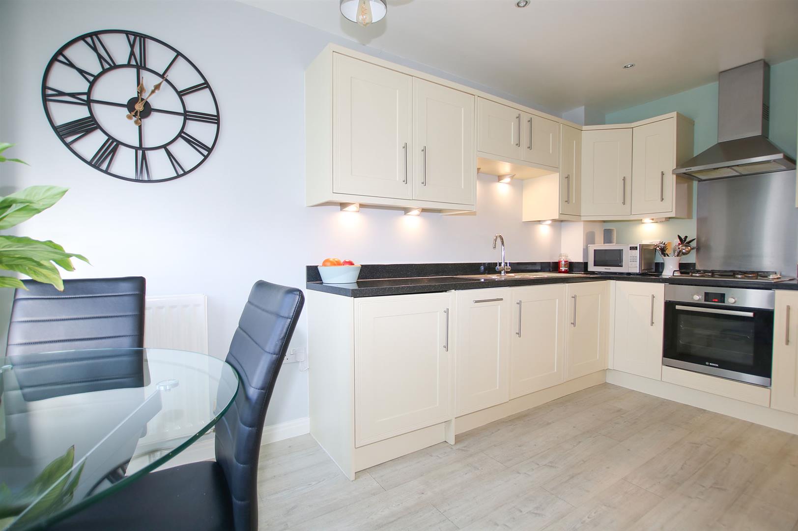 Fitted with a range of eye level and base storage units with granite effect working top surfaces over, under cabinet feature lighting, inset sink unit with mixer tap over, built in oven, separate four ring gas hob with extractor hood over, built in fridge/freezer, built in washing machine, built in dishwasher, wood effect flooring, ample room for dining table and chairs, window to the front aspect.
