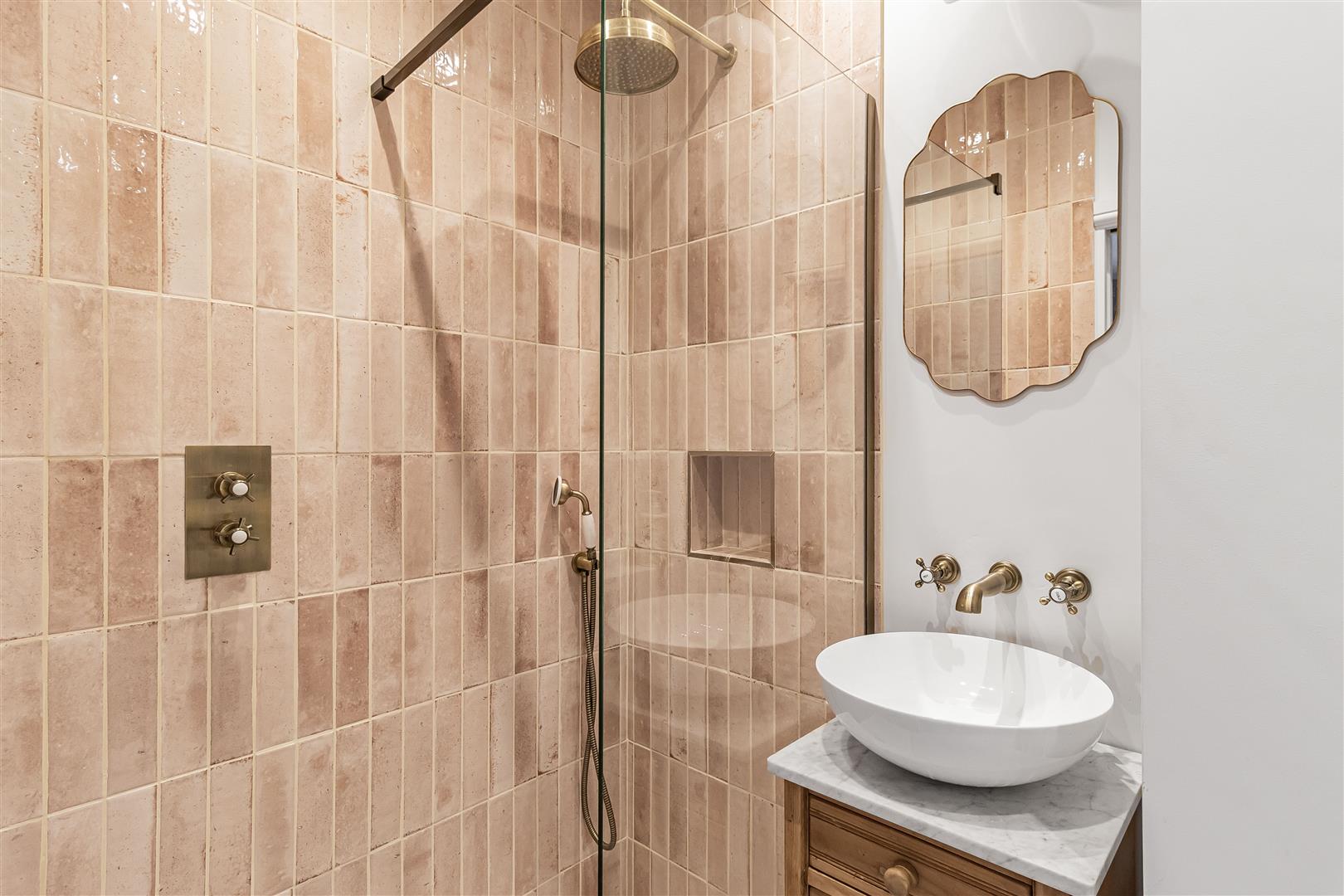 Exceptional contemporary bathroom with suite comprising Victorian style W.C., inset handbasin with mixer tap over and storage cabinet under, panelled bath with wall mounted shower over, attractively tiled with built-in niche shelf . Tiled flooring. Victorian style radiator. Obscured window. Door leading to the landing.