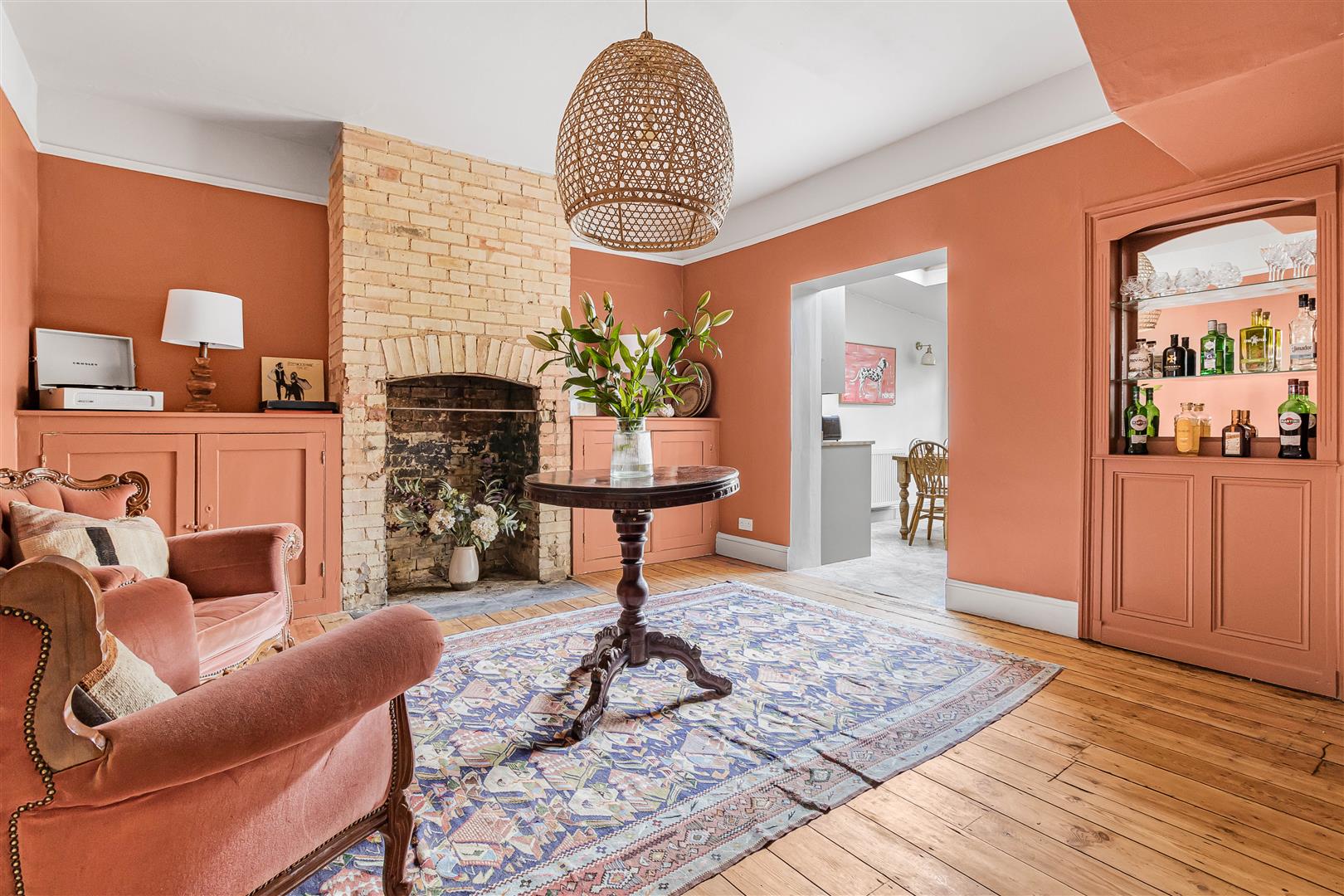 Beautifully presented living room with exposed wooden flooring. Feature fireplace with attractive white surround and mantel, stone hearth and exposed brick firebox. Contemporary built-in cabinets and shelving to the alcoves either side. Dual window to the front aspect. Radiator. Door leading to the entrance hall.
