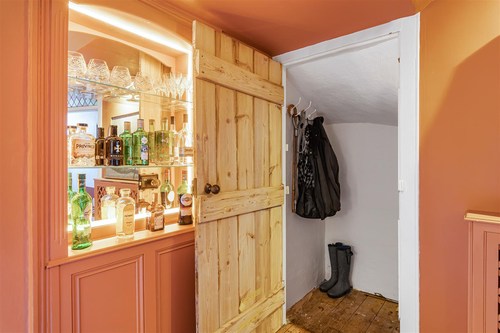 Charming dining room with exposed wooden flooring. Exposed brick feature fireplace with stone hearth and alcoves either side with built-in storage cabinets. Built-in display shelving. Radiator. Opening to the kitchen/breakfast room. Door to under stair storage cupboard. Door, with attractive stain glass top light, to the entrance hall.