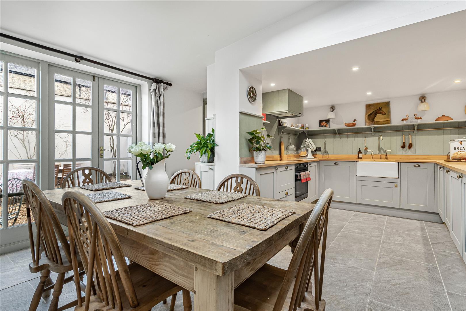Stunning contemporary Shaker style kitchen with a range of base level cupboards and storage drawers with wooden worktop over. Inset Butler sink with mixer tap over. Integrated oven with induction hob and extractor above. Integrated dishwasher. Integrated fridge and freezer. Spacious dining area. Attractively tiled flooring. Radiator. Light well skylight. Openings to inner hallway and dining room. French doors leading to the courtyard garden.