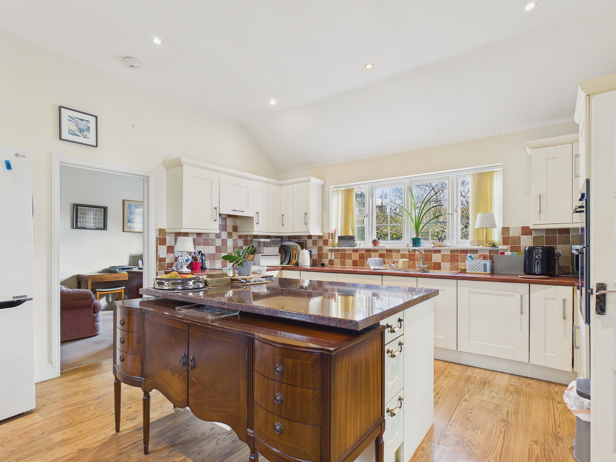 uPVC double glazed windows to front and rear, uPVC double glazed door to rear, wall mounted double panel radiator, wall and base units under round edge worksurfaces, 1 1/2 stainless steel sink drainer inset with mixer tap over, 4 ring electric hob with extractor over, eye level double oven, integral fridge and freezer, integral dishwasher, centre island with storage drawers and breakfast bar, laminate style flooring, high ceilings with spotlights inset, door to bedroom two, door to:-