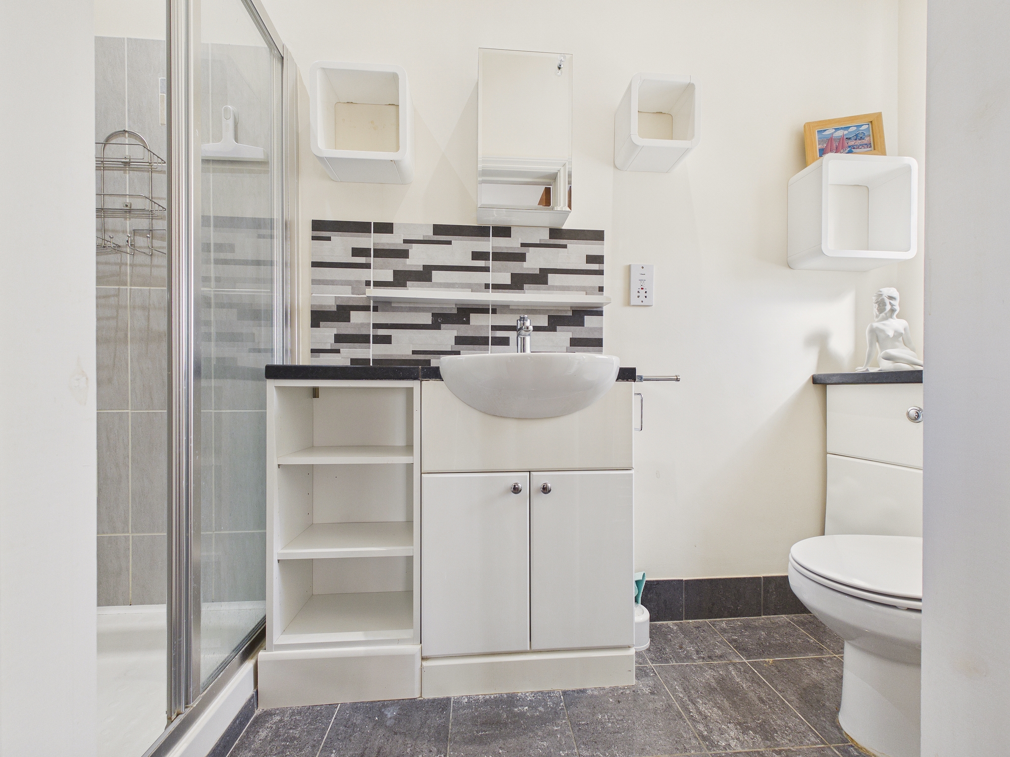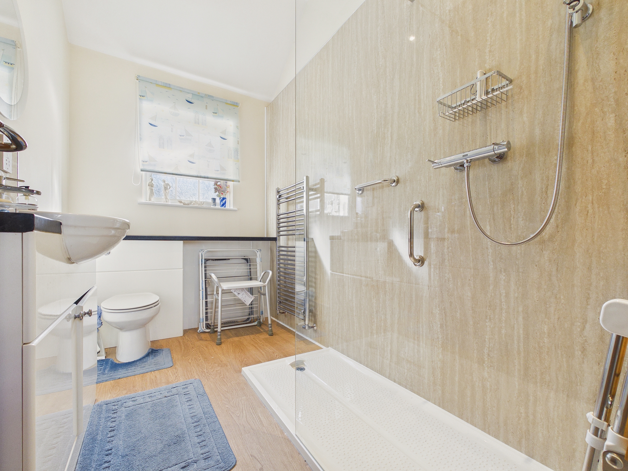 Wall mounted heated towel rail, walk in double shower with drying area and glass screen, concealed cistern w.c., handwash basin inset to vanity unit, laminate style flooring, shaver socket, high ceilings with spotlights and extractor inset.