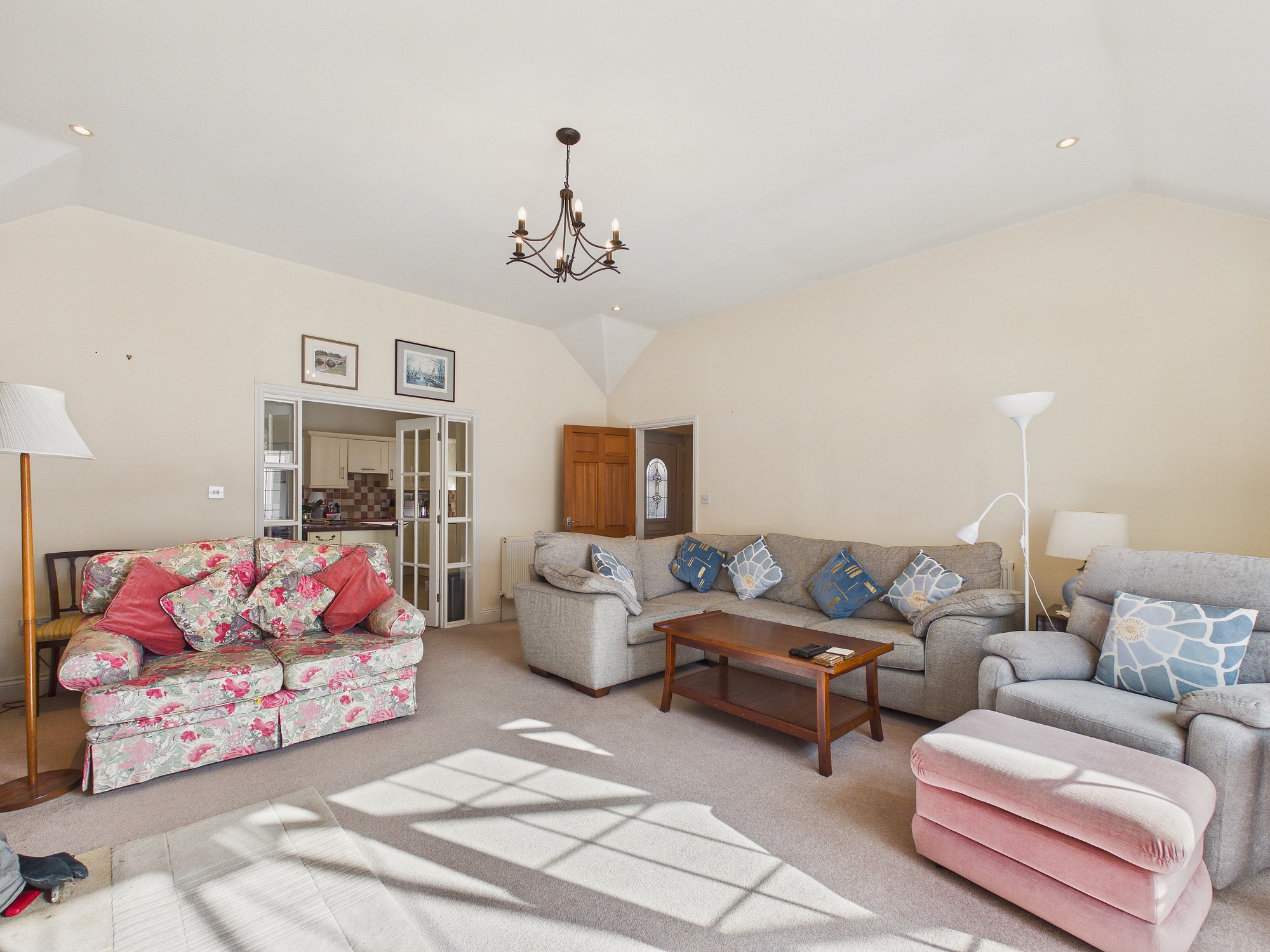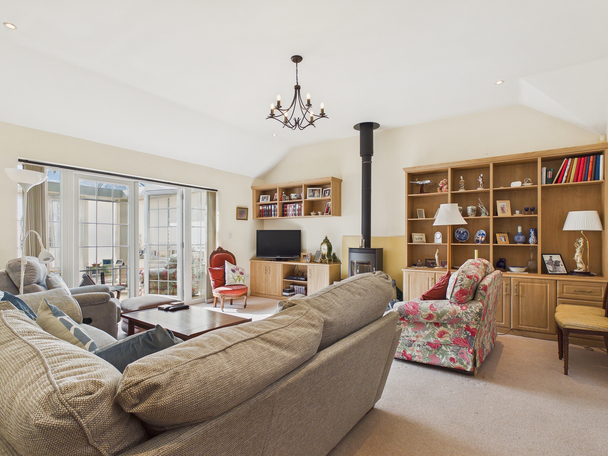 2 x wall mounted double panel radiators, central multi fuel burning stove, high ceilings with spotlights inset, uPVC double glazed doors to conservatory, part glazed double doors to:-