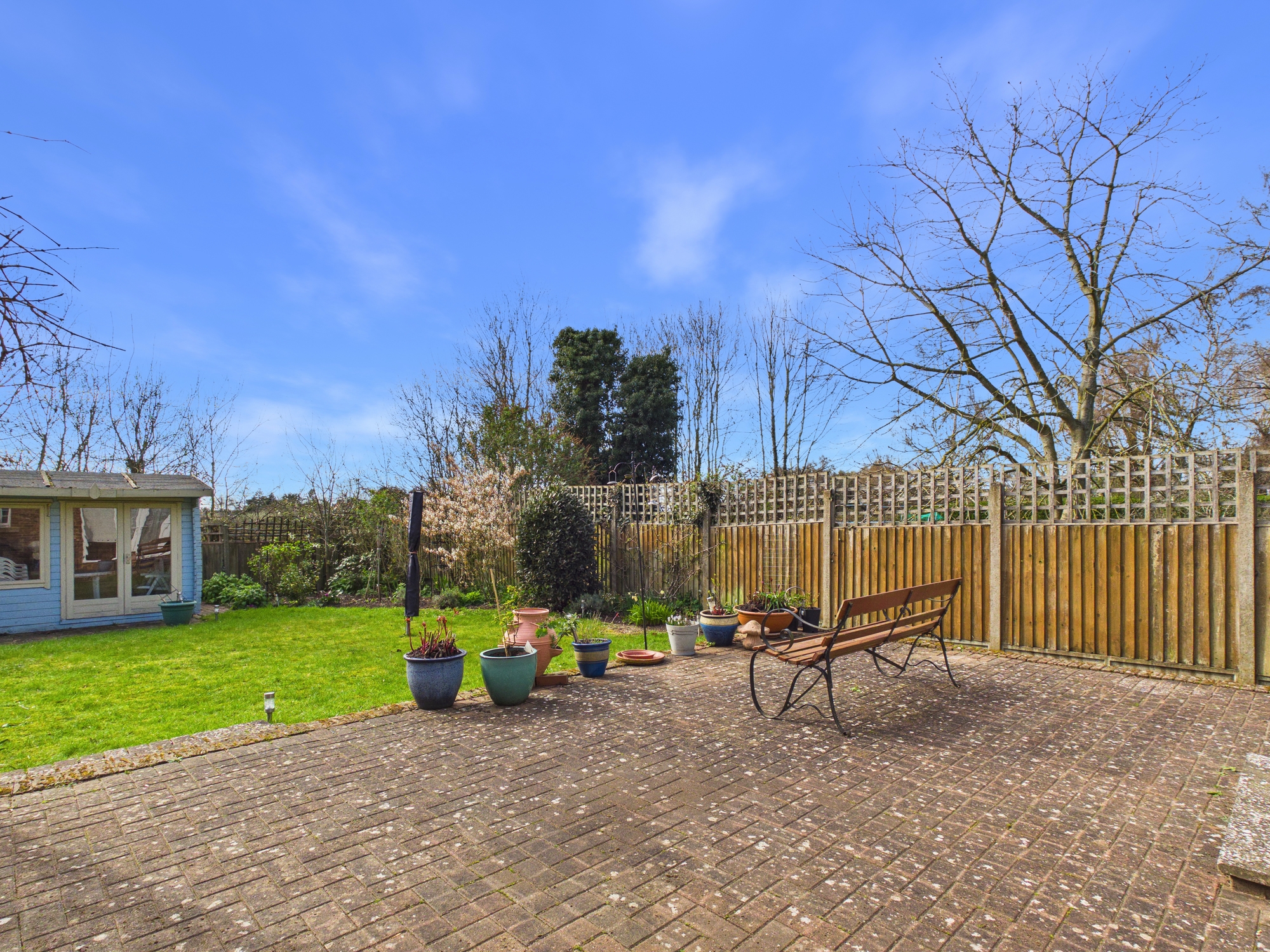 The driveway to the front is shared with neighbouring properties and has two allocated parking spaces. A five bar wooden gate leads through to the private driveway which is also laid to shingle and providing further off road parking and leads to the double garage with electric door and storage area above. There are brick weave pathways to both sides leading to the rear garden. Here there is a brick weave patio area with steps down to the garden which is laid to lawn with bushes and shrubs to borders. There is also a wooden summerhouse inset.