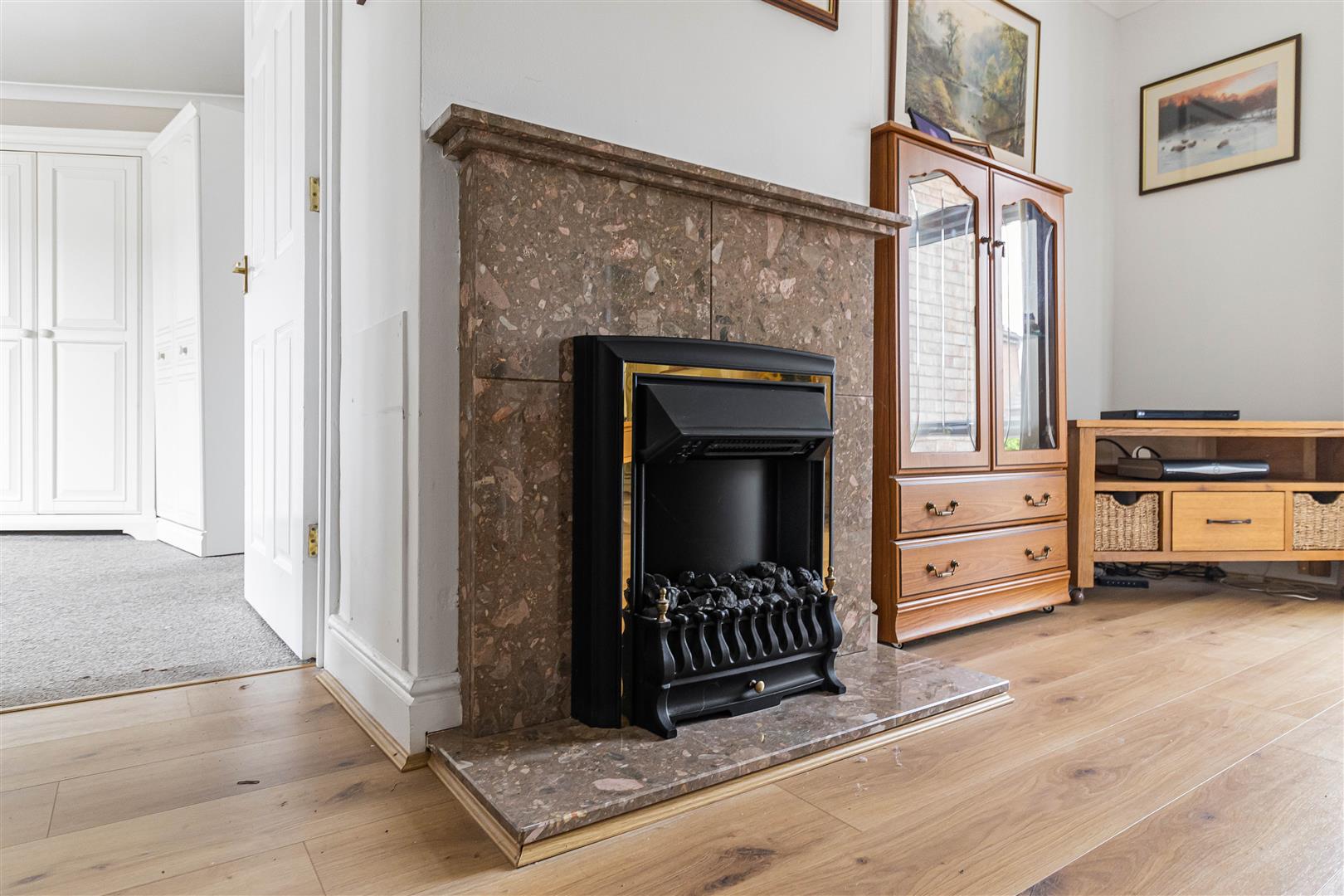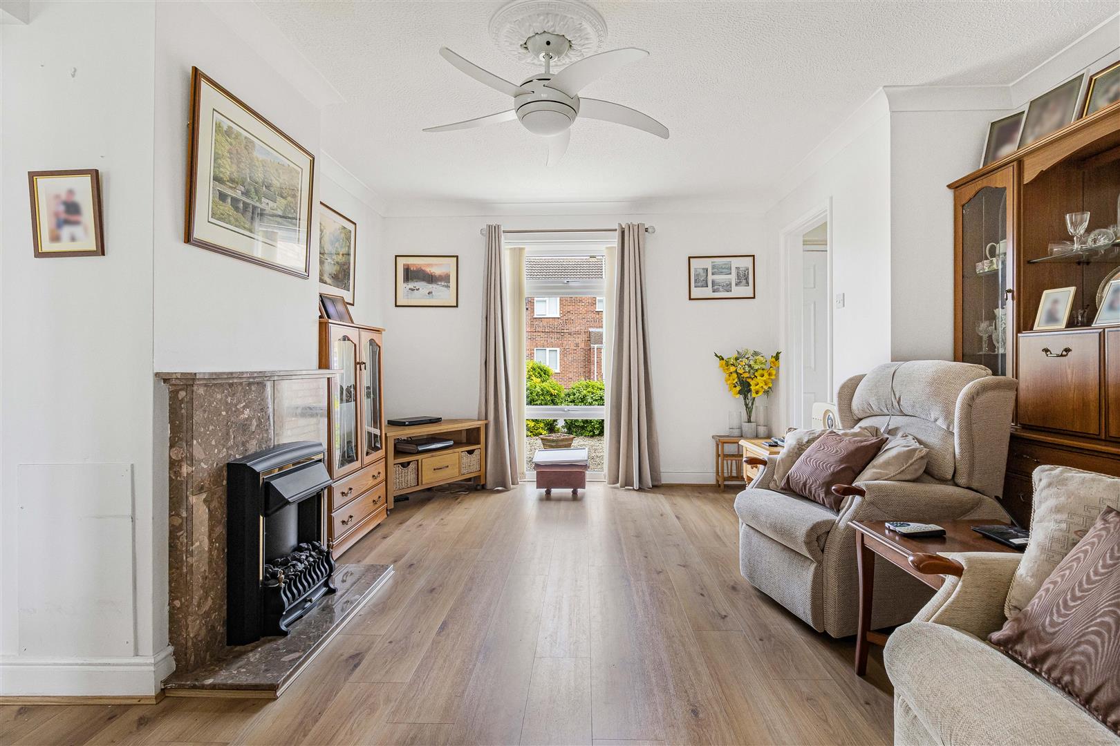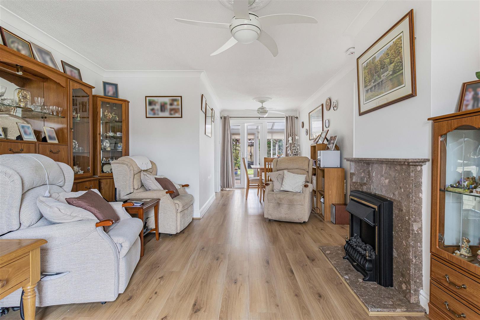 Spacious living/dining room with feature fireplace with marble surround, mantel and hearth, currently fitted with coal effect fire. Laminate wood flooring. Full height window to the front aspect. Spacious dining area. French doors leading to the conservatory. Radiator. Opening to the kitchen. Door leading to the entrance hall.