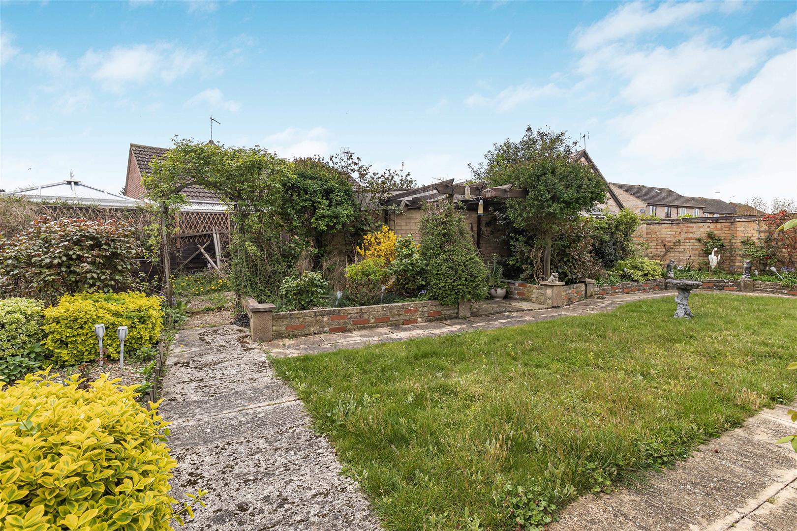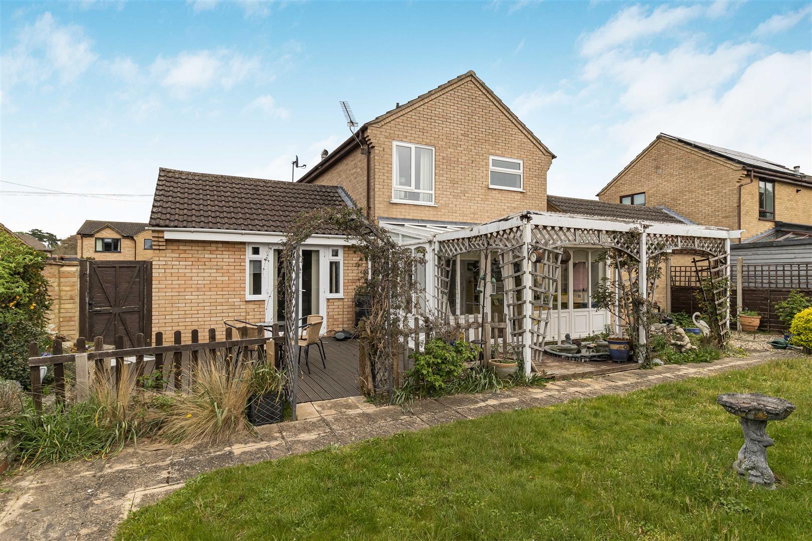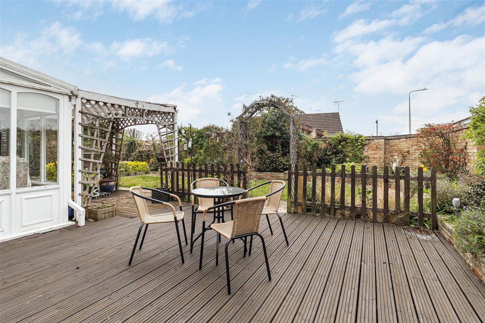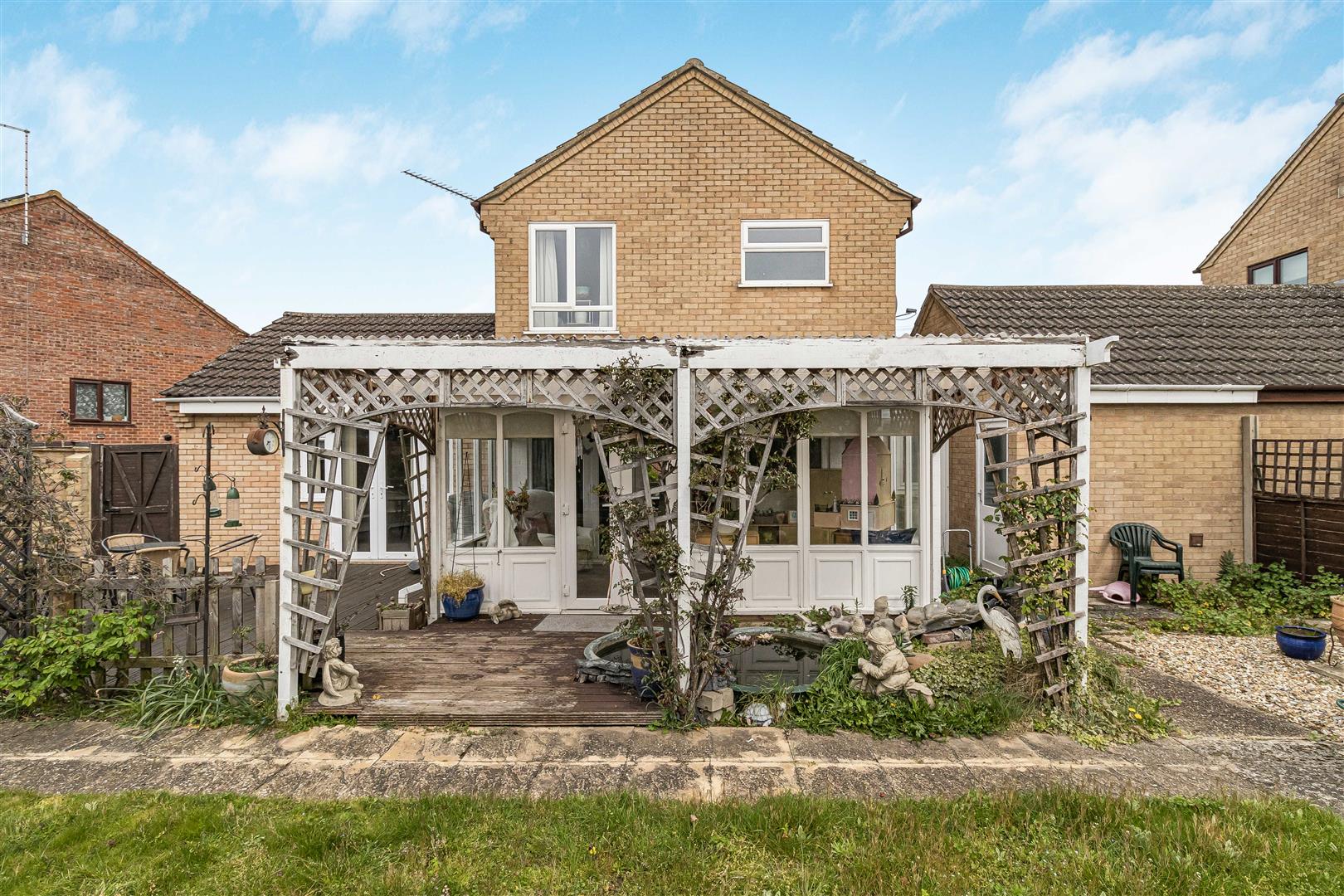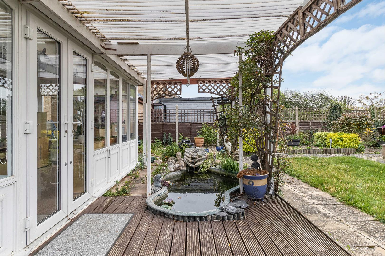 Decking area to the rear of the house with French doors leading bedroom 1. Further decked area with inset ornamental pond with French doors leading to the conservatory. Paved area leading to the lawn with some established planting to the borders. Door leading to the covered lobby. Access gate to the4 front.
