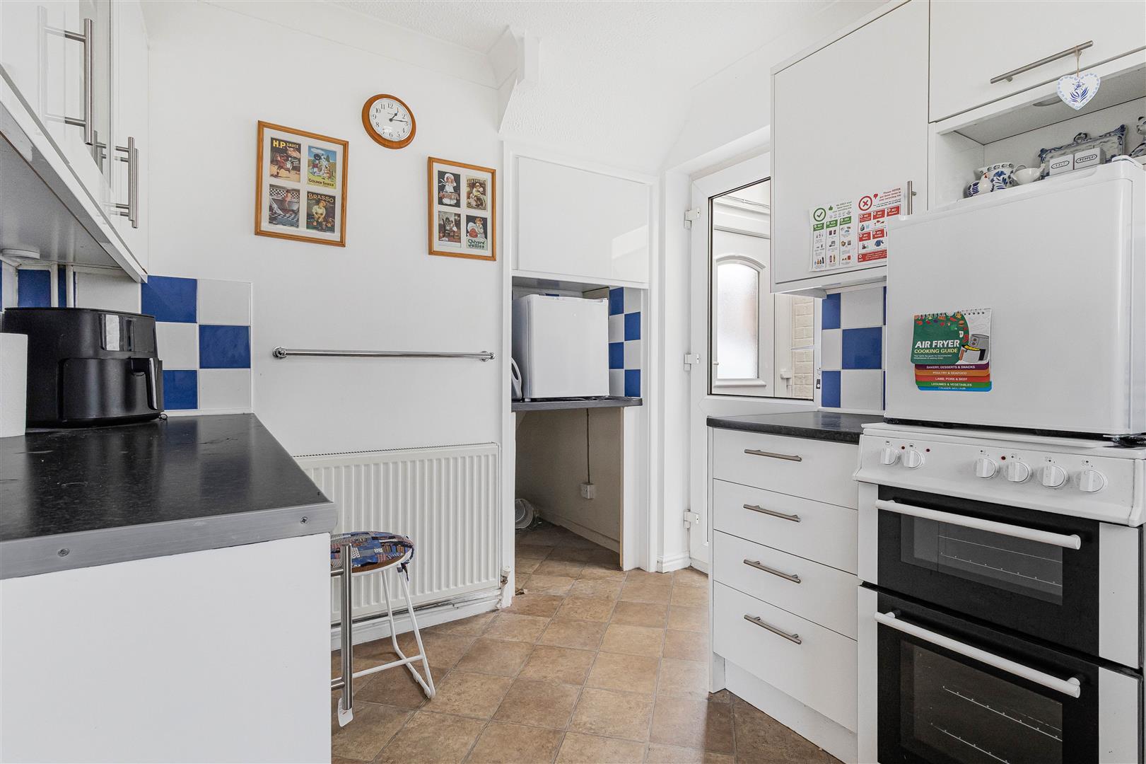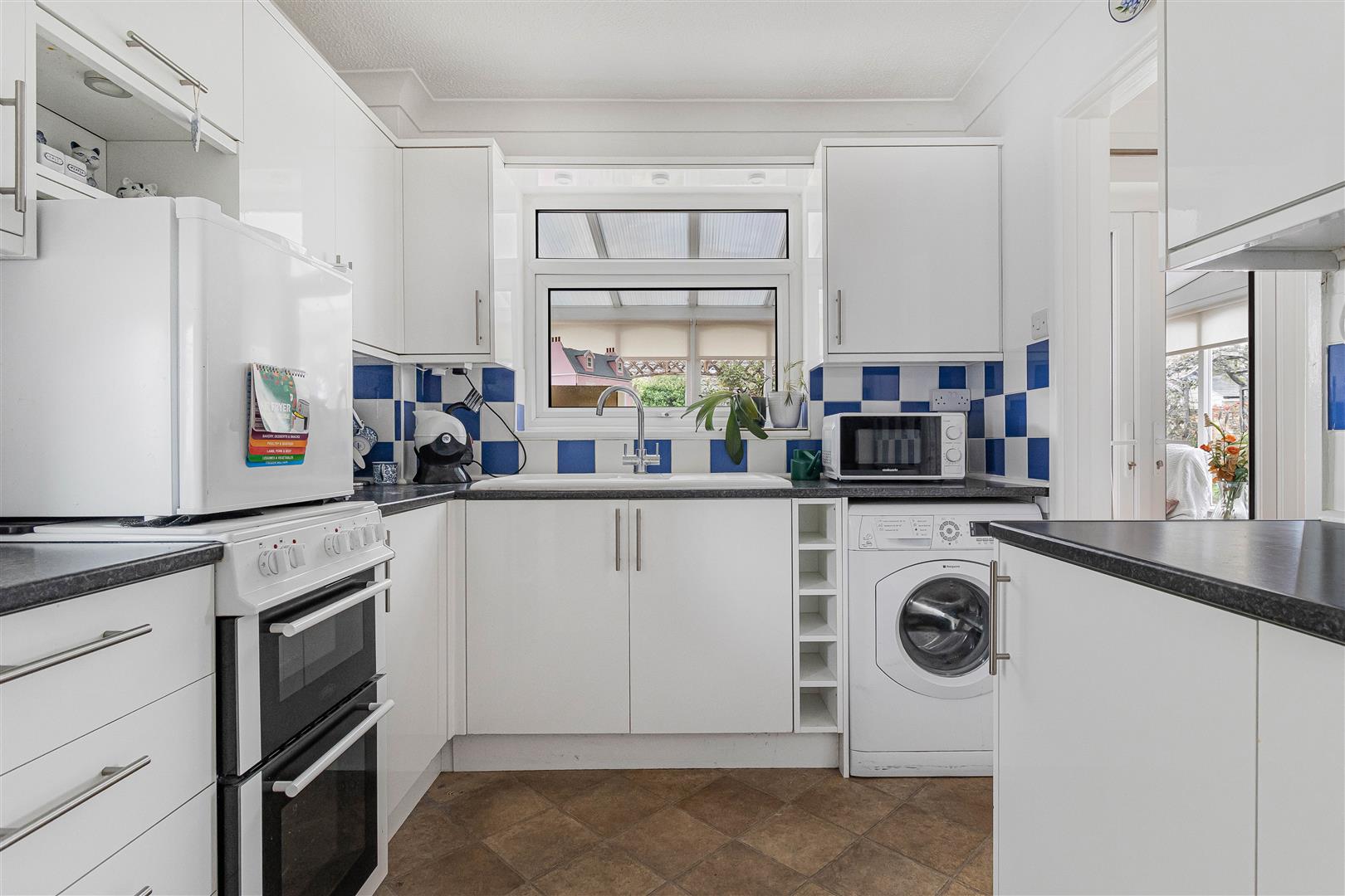 A range of fitted eye and base level cupboards with worktop over. Ceramic sink and drainer with mixer tap over. Space and connection for free standing cooker. Space and plumbing for washing machine. Tiled splashbacks. Built-in pantry cupboard. Internal window to the conservatory. Opening to the living/dining room. Door to the covered lobby.