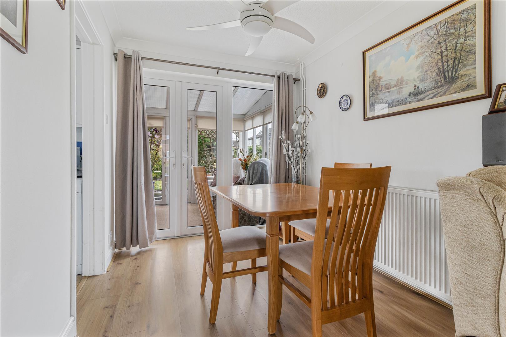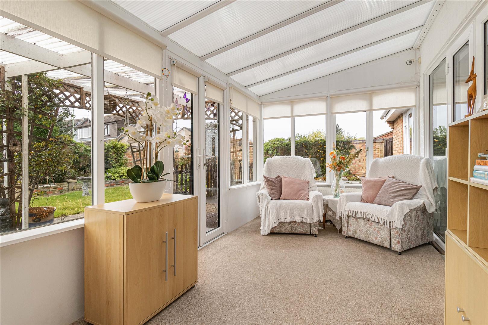 Pleasant conservatory with french doors leading to the rear garden. Internal window to the kitchen. French doors leading to the living/dining room.
