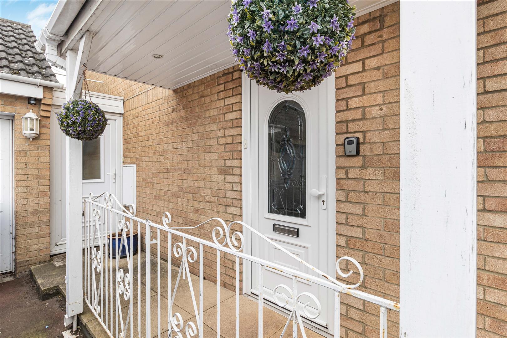 Gravelled area with established shrub boundary. Pathway leading to the front door with storm porch over. Hardstanding driveway, providing off road parking, leading to the garage. Door leading to covered lobby.