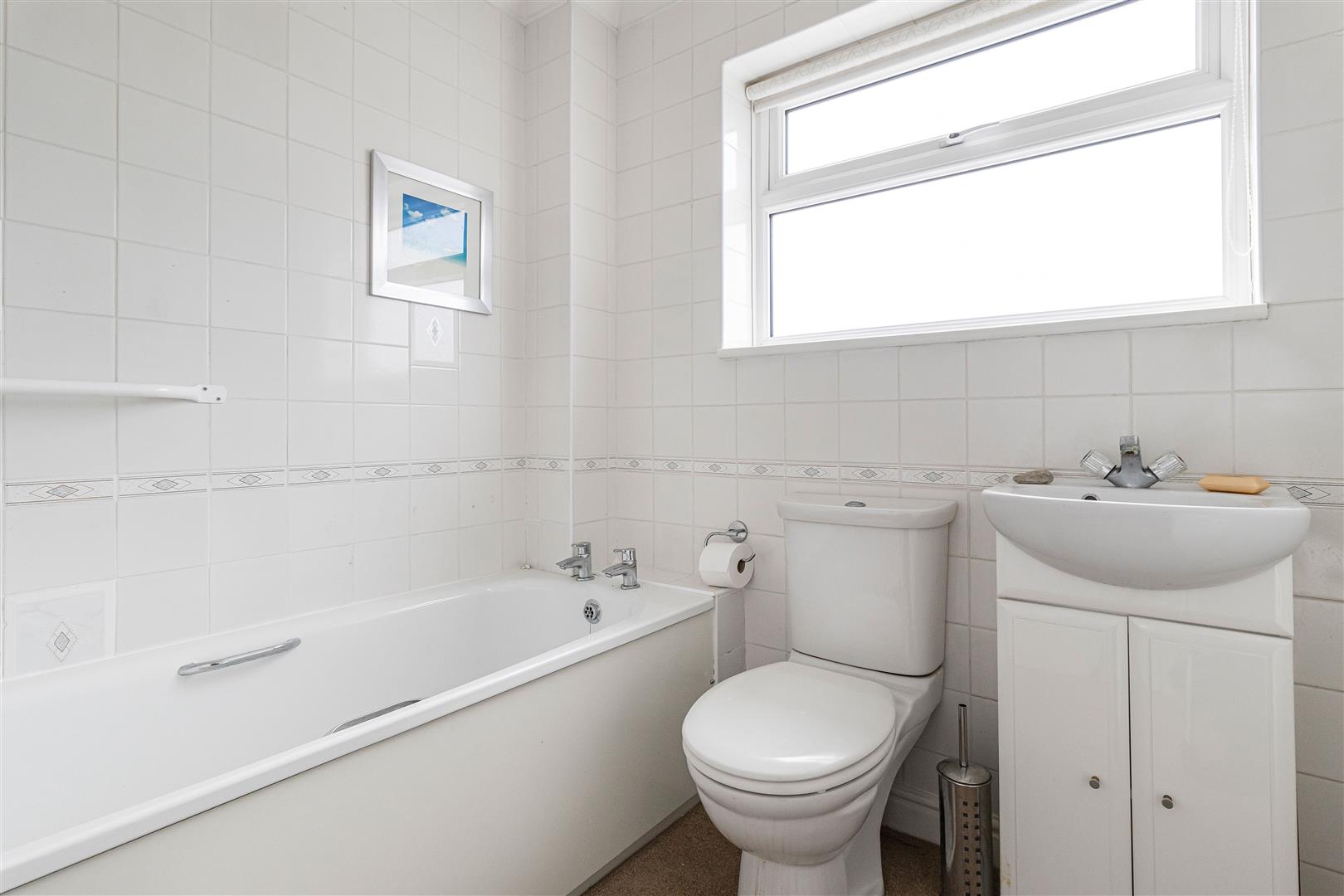 White suite comprising low level W.C., wall mounted handbasin with mixer tap under and built-in storage cabinet under and panelled bath. Tiled walls. Obscured window. Door leading to the landing.